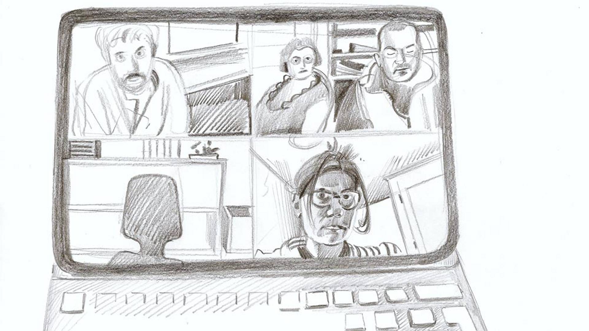 Christine Aebi unterrichtet die Jugendlichen des Gestalterischen Vorkurses an der Schule für Gestaltung St.Gallen und hat sich unseren Fragen gestellt (die Skizze hat Christine Aebi während einer Teams-Teamsitzung gemacht – also auch ein Viertel Selbstporträt, wenn man so will, sie selbst ist unten rechts abgebildet):
