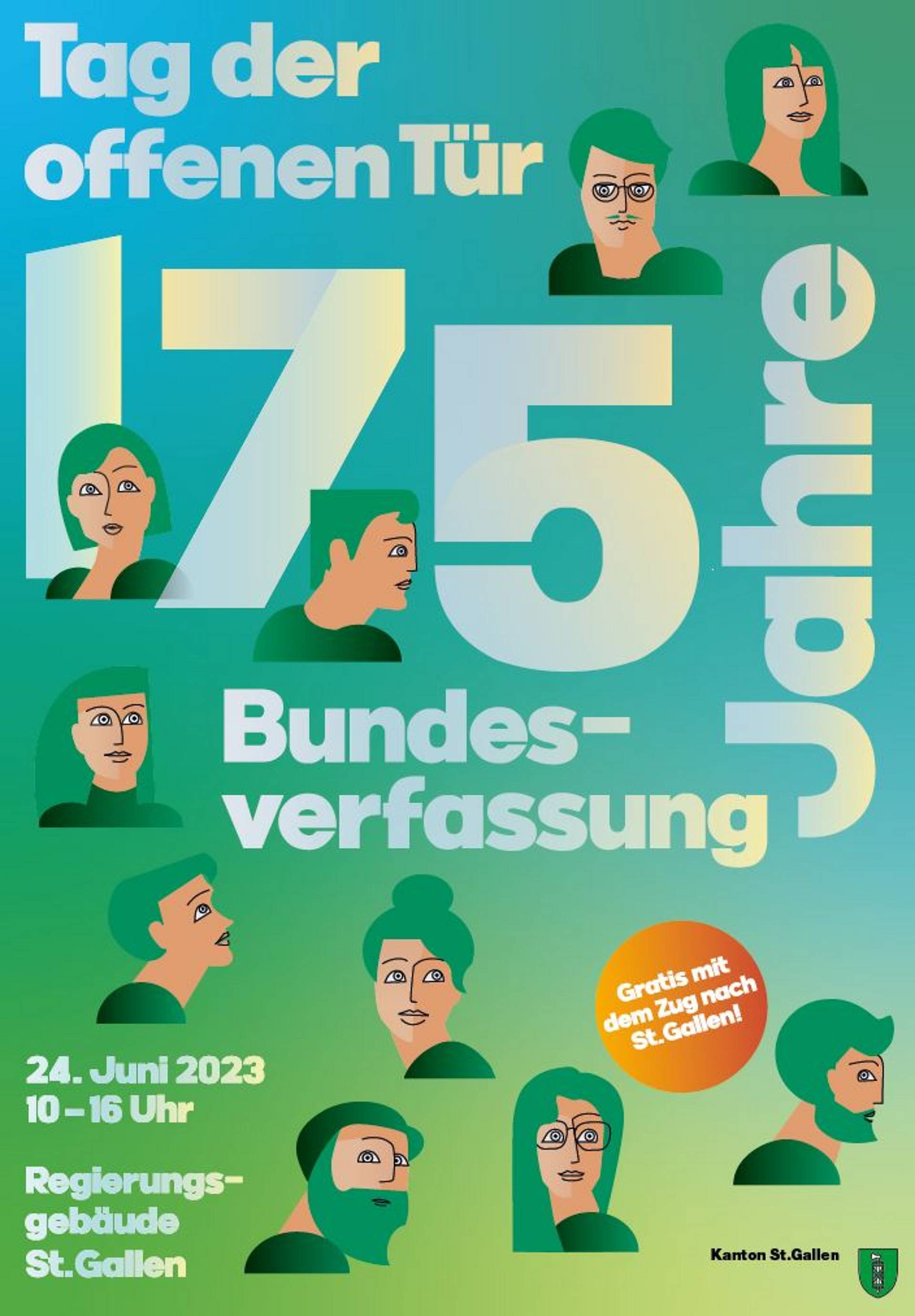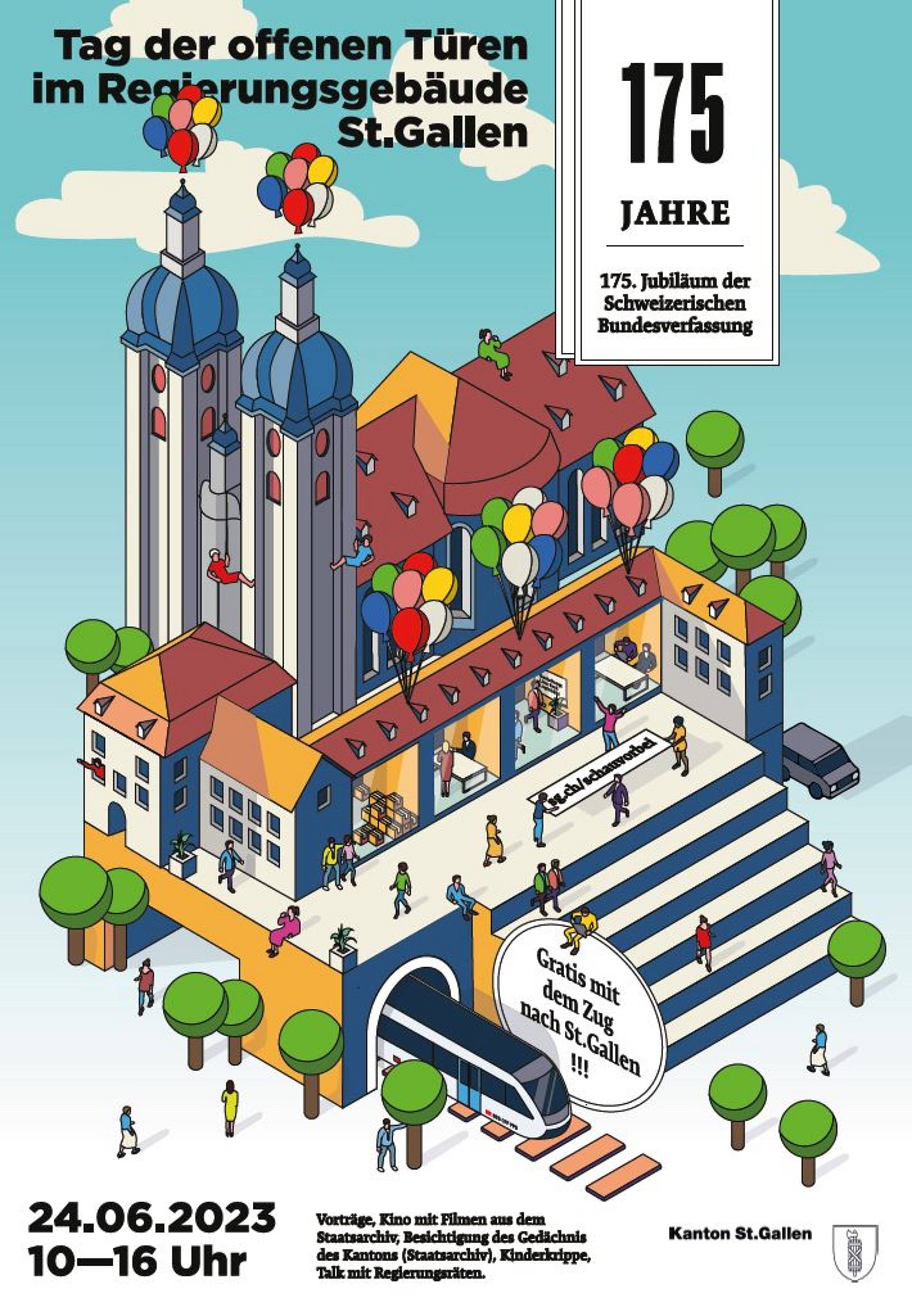Im ganzen Kanton St.Gallen wird das Plakat von Lino zum Tag der offenen Türen der St.Galler Regierung zu sehen sein. Anlass ist das 175-jährige Jubiläum der Schweizer Bundesverfassung. Die Anreise mit dem öffentlichen Verkehr ist für alle Bewohner/-innen im Kanton gratis. «Linos Plakat ist lebendig und farbig und weckt die Lust auf dieses Fest», lobt Regierungsrätin Laura Bucher, Vorsteherin des Departements des Innern. Am besten gefalle ihr die Aussage, dass das Regierungsgebäude eine offene Bühne sei. «Hier sind am 24. Juni alle willkommen und können mit uns Politiker/-innen in Kontakt kommen», sagt sie.