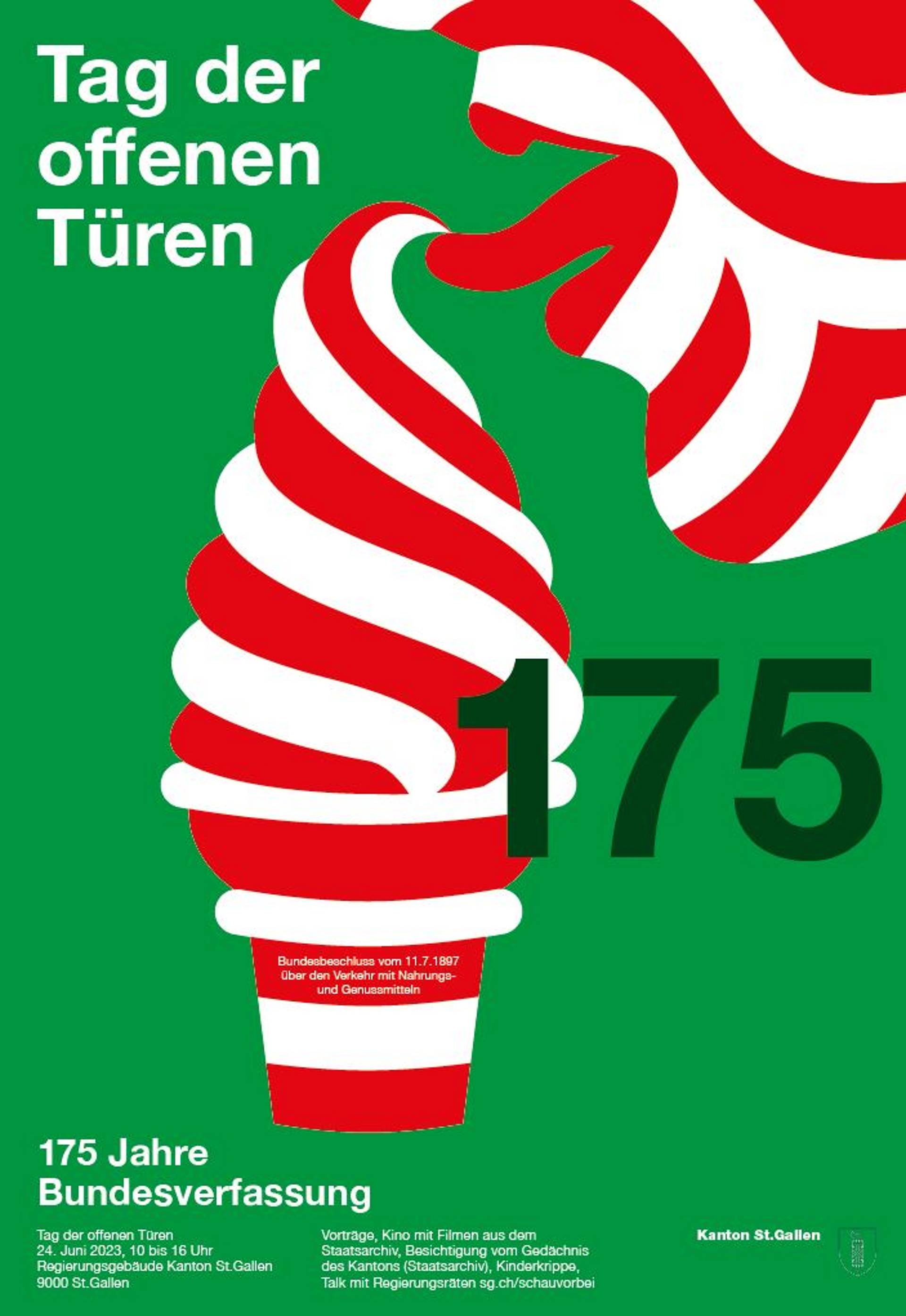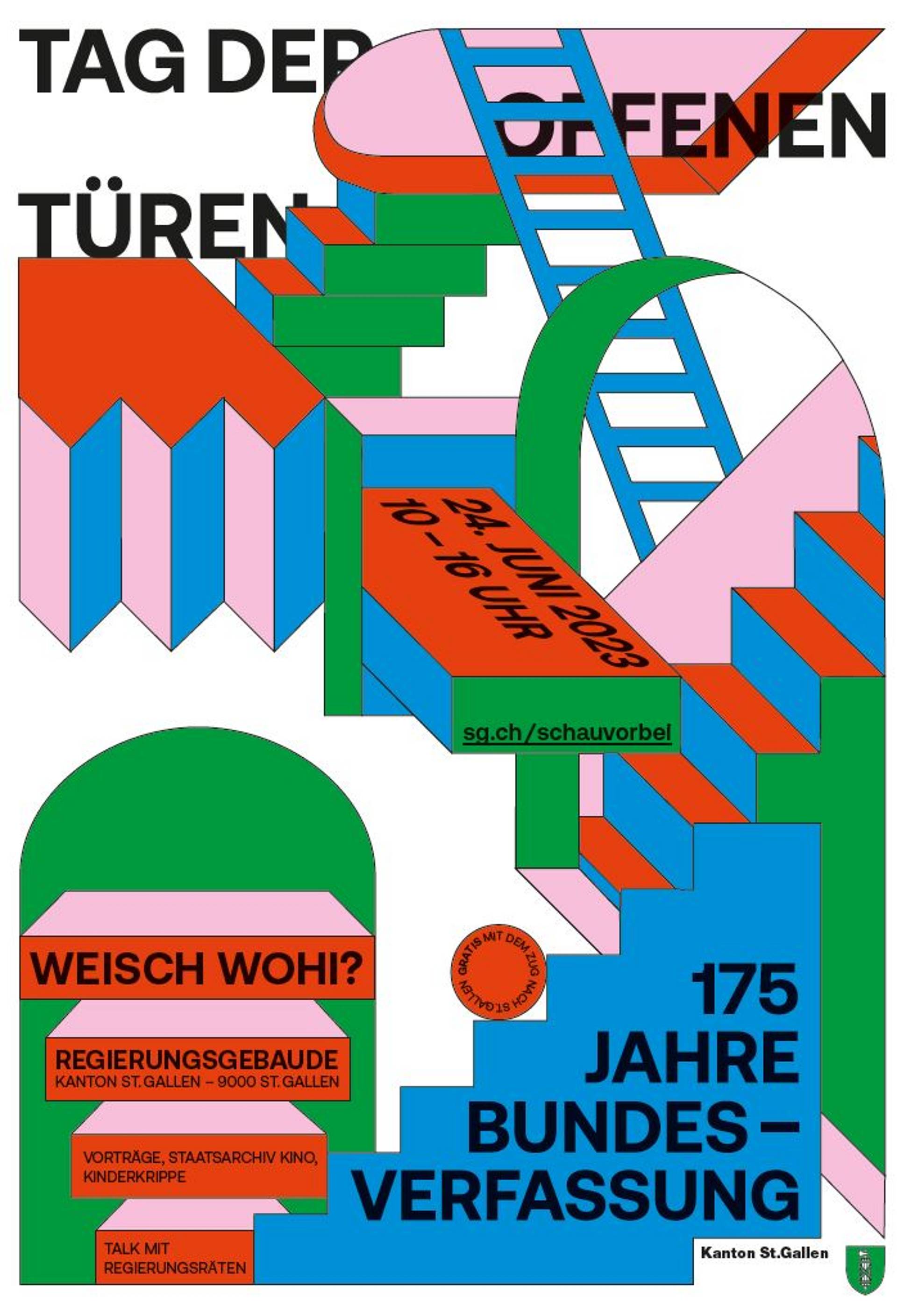Normalerweise sind diese Türen verschlossen, aber am 24. Juni 2023 öffnet der Kanton St.Gallen für die Bevölkerung die Türen des Regierungsgebäudes. Das Werbeplakat für den Anlass entstand an der Schule für Gestaltung St.Gallen. Der angehende Grafiker Lino überzeugte mit seinem Vorschlag besonders.