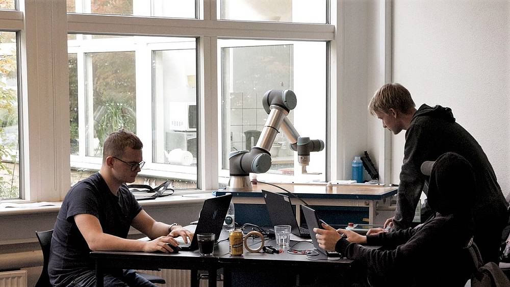 Am Robocup lösen vier Schüler/-innen aus vier verschiedenen Ländern vier Teilaufgaben. In der Roskilde Tekniske Skole montierten die Teilnehmenden das Greifwerkzeug an einem Roboterarm. Anschliessend wurde der Roboterarm so programmiert, dass er die Teile nach einem Muster sicher bewegt.