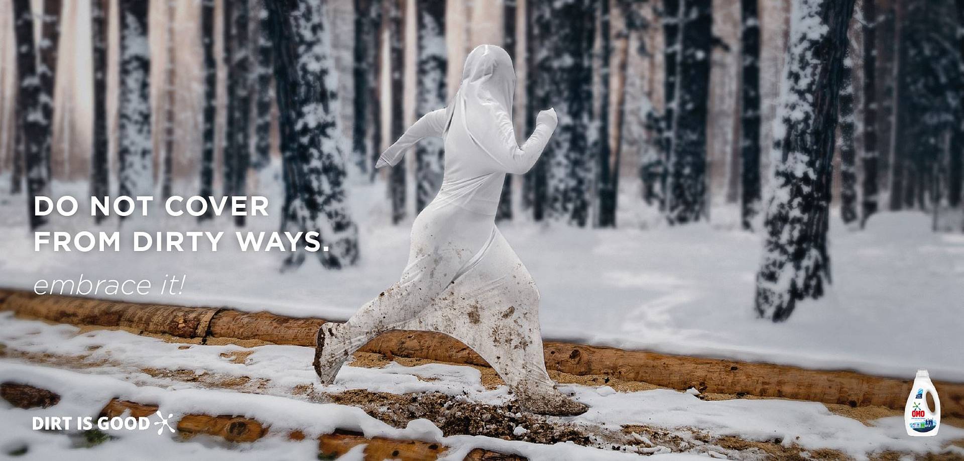Ihre Kampagne «Dirt is Good» soll junge Erwachsene dazu motivieren, bei jedem sportlichen Erfolg wie auch bei jeder Niederlage weiterzumachen. Dabei steht im Fokus, dass dreckig werden keine Niederlage signalisiert. Um die passenden Sujets abzubilden, waren die Studierenden auch auf einem Schwingplatz. Als Schrift wurden die von Omo vorgegebenen Gotham Bold und Gotham Light Italic gewählt.