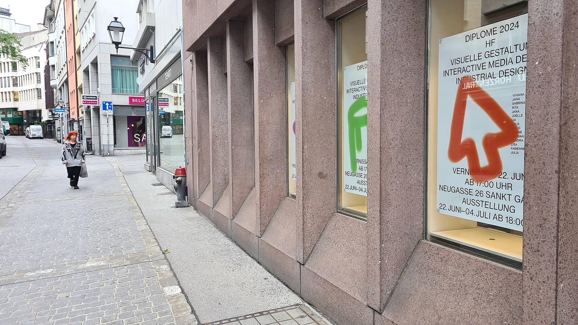 Dass eine breite Öffentlichkeit die Möglichkeit erhält, sich ihre Werke anzuschauen, kommt bei den HF-Studierenden an. «Mega cool», finden Viviana Arena (Visuelle Gestaltung HF) und Manuel Ackermann (Interactive Media Design HF) spontan und unabhängig voneinander. «Die Passanten sehen bereits von aussen, dass wir hier ausstellen», sagt Viviana. Manuel schätzt die Möglichkeit, die Arbeiten im Herzen der Stadt zu präsentieren und dabei die urbane Atmosphäre aufzusaugen.