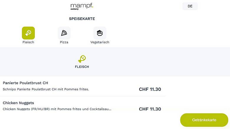 Das Mampf-Team bittet dich, zuerst das Tablett und das Besteck zu beziehen. Anschliessend holst du dir dein bestelltes Getränk und erst danach das Essen. Bevor du das Essen entgegennimmst, zeigst du deine digitale Bestellbestätigung. So funktioniert es mit einem reibungslosen Ablauf und niemand verliert Zeit.
