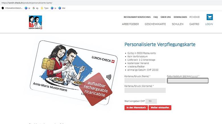 Bestelle eine physische Lunch-Check-Karte unter diesem Link für einmalige 20 Franken und lade dir gleich ein Guthaben drauf: