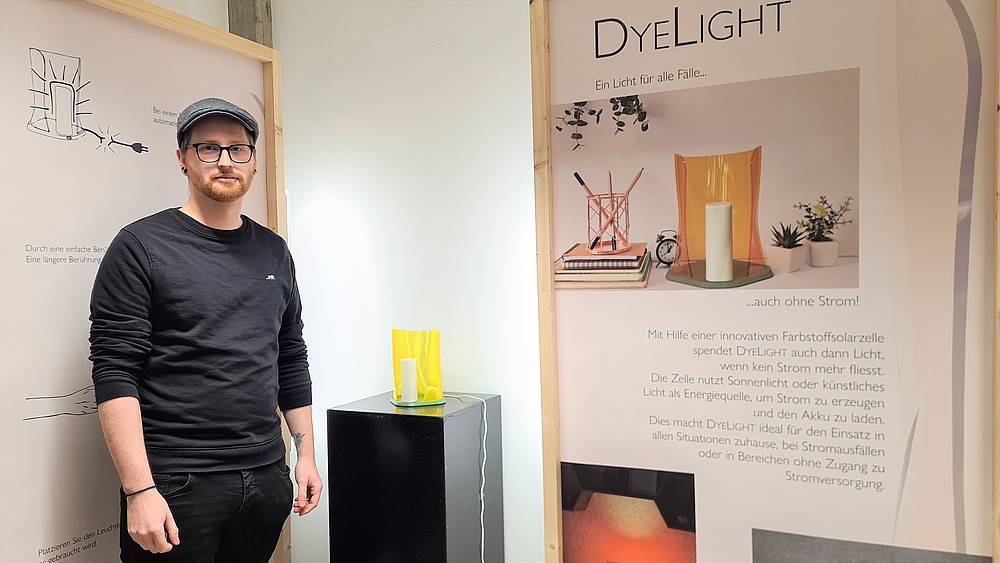 Noah Hirschi hat für sein Vordiplom eine innovative Lichtquelle entworfen. Mit Hilfe einer umweltbewussteren Farbstoffsolarzelle spendet DyeLight auch dann Licht, wenn kein Strom mehr fliesst. Mehr über das Studium Industrial Design HF an der Schule für Gestaltung St.Gallen erfährst du hier.