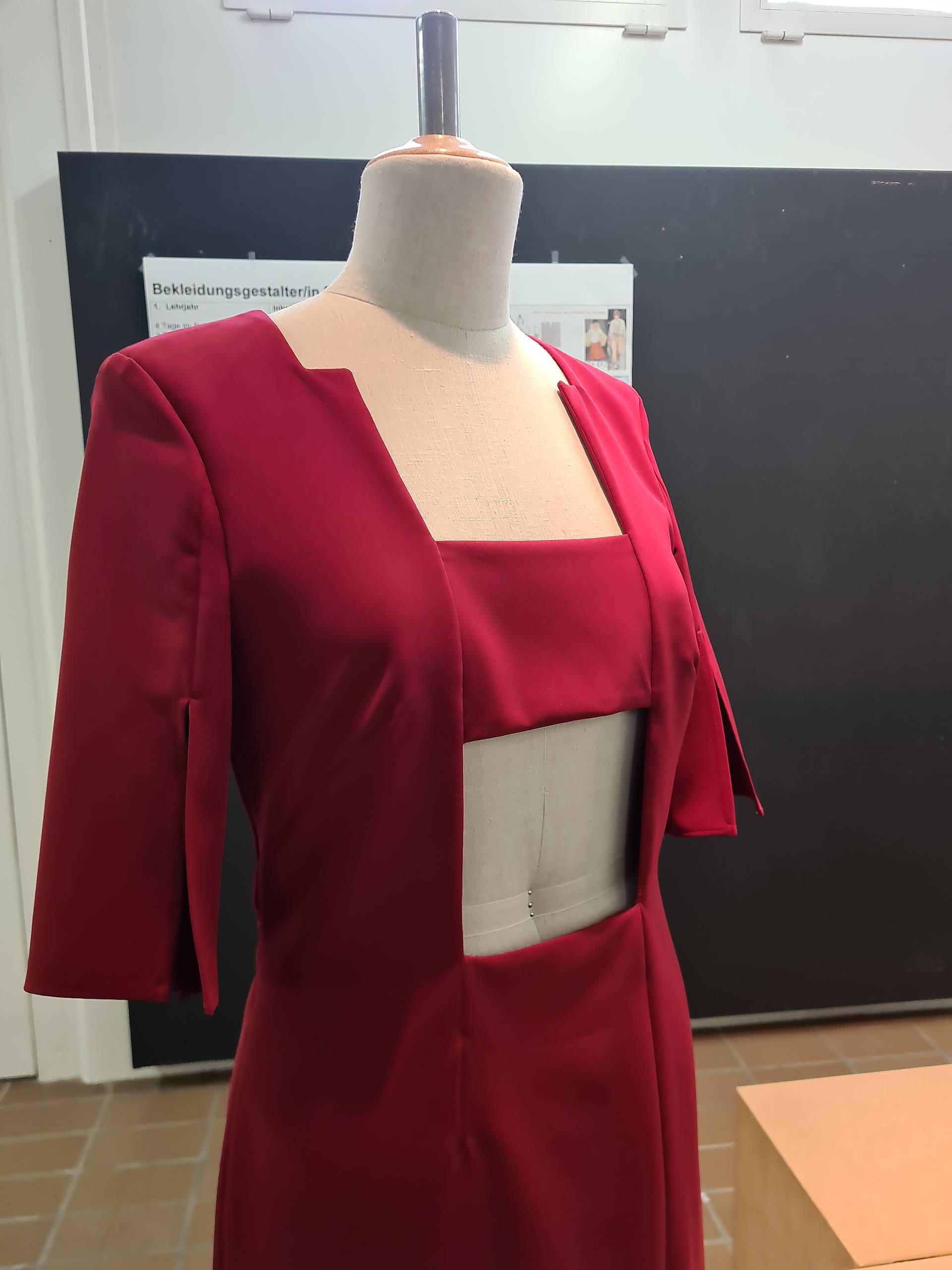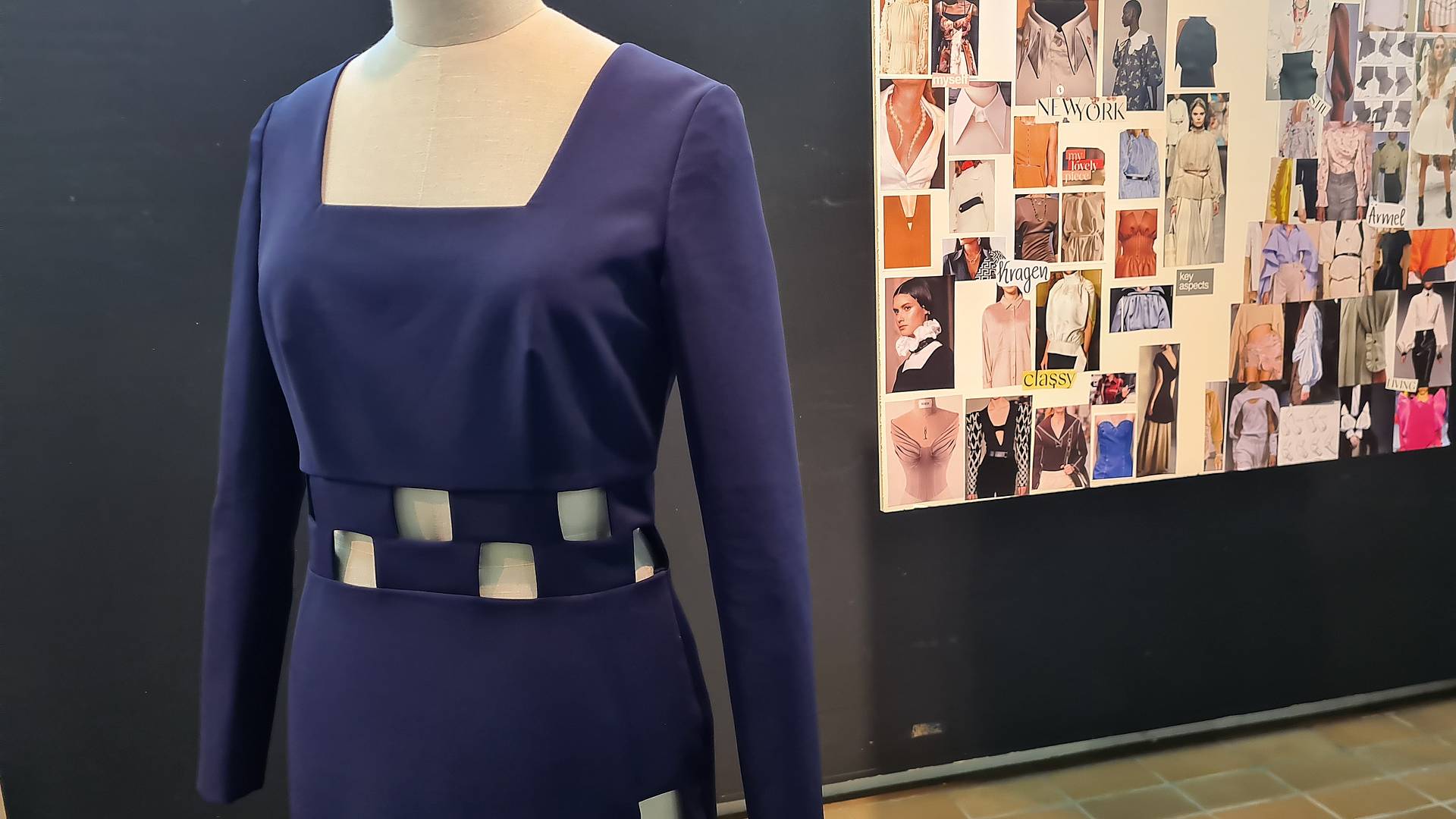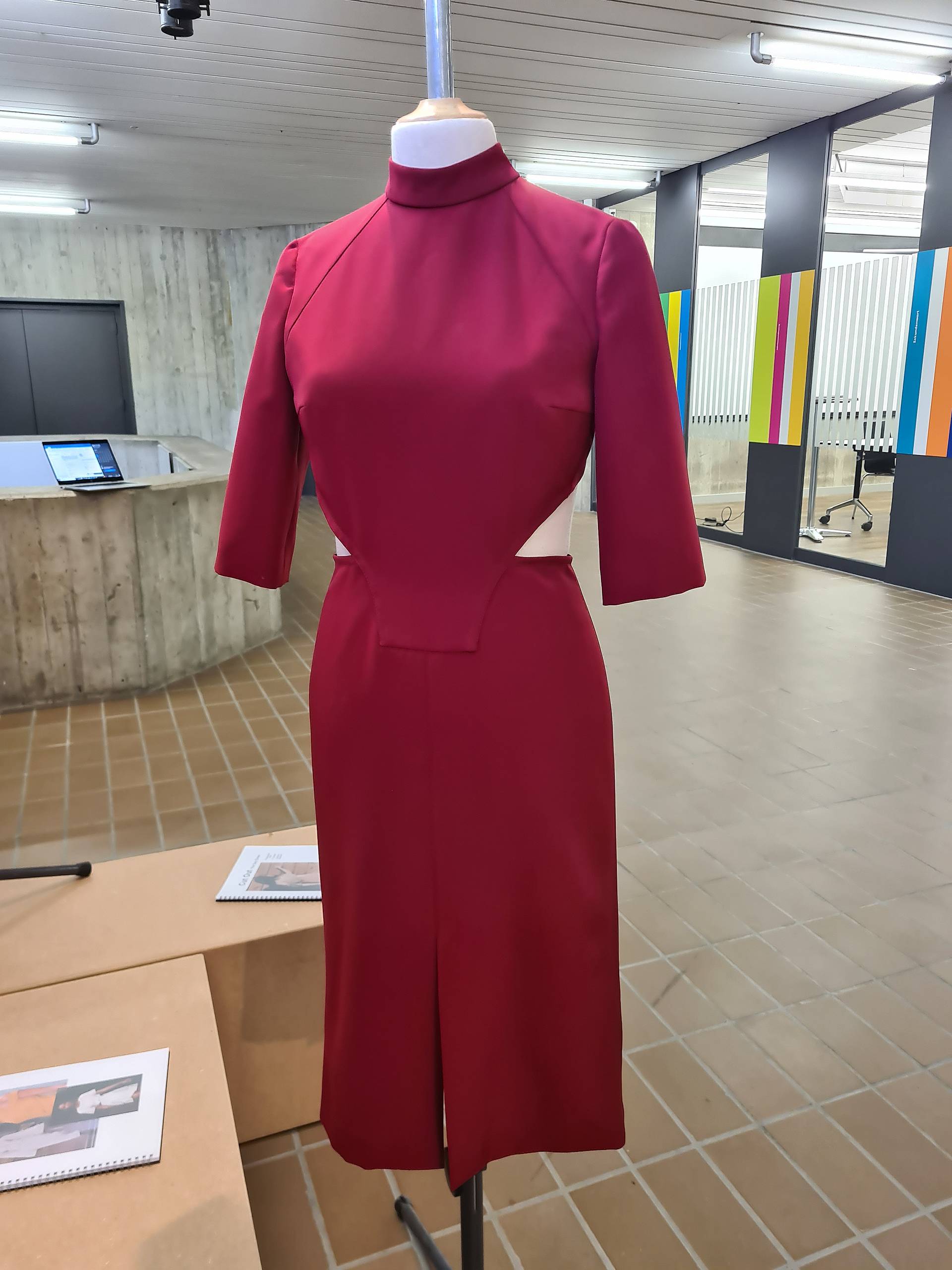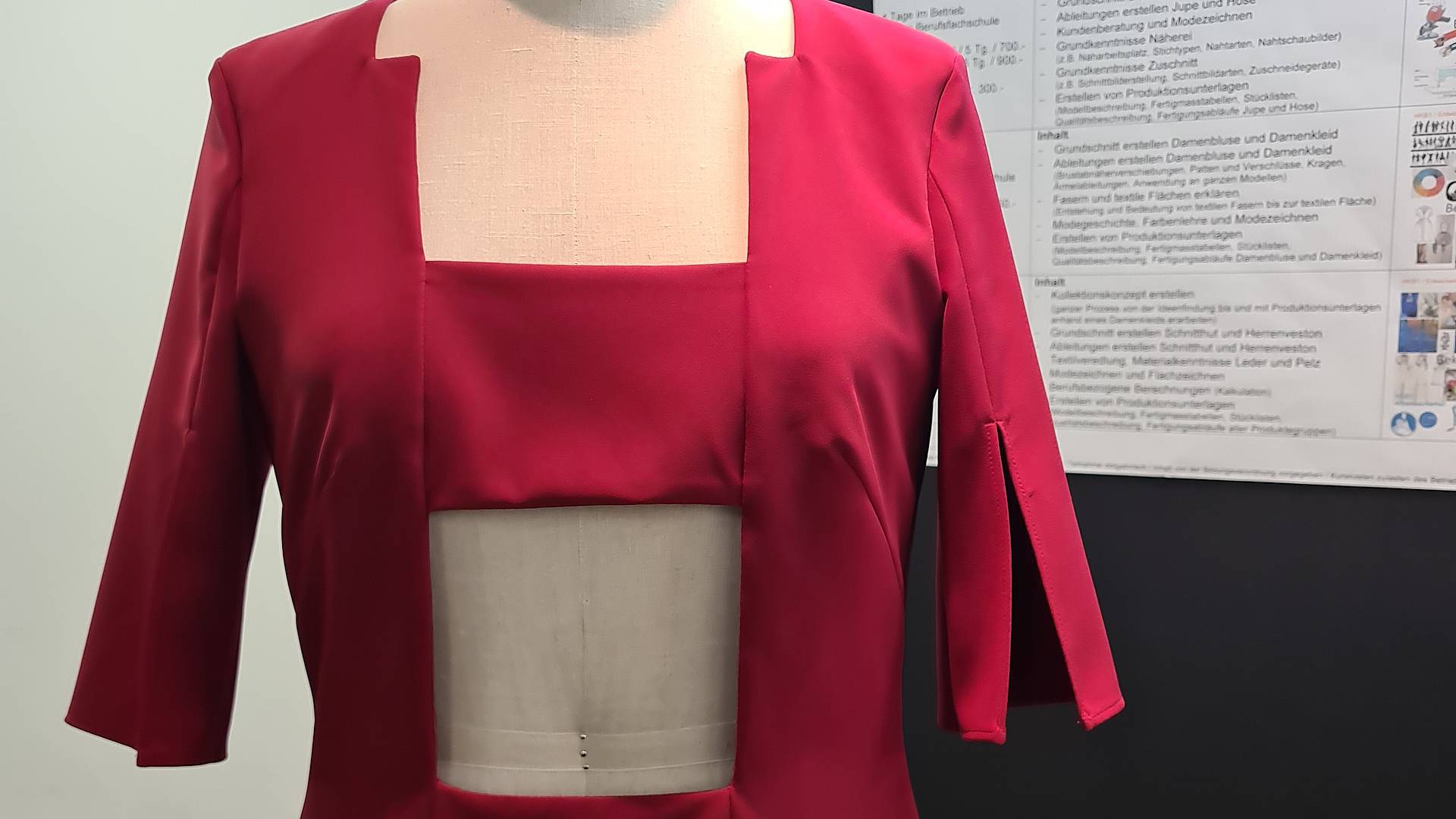 In einem nächsten Schritt wurden die Skizzen in colorierten Modezeichnungen dargestellt, um das Modell zu visualisieren. Ausserdem fertigten die Lernenden technische Flachzeichnungen und technische Detailzeichnungen an. Anschliessend folgten Schnittgewinnung und Anprobe. «Für mich war es interessant zu sehen, wie sich mein Kleid von einer Skizze in ein finales Kleidungsstück entwickelt», sagt Christoph.