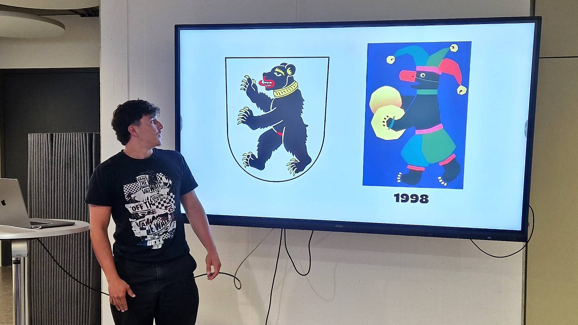 Das Ziel der Lernenden war es, die Atmosphäre der Fasnacht auf Plakat, Flyer und Pin zu übertragen. Der Bezug zur Stadt durfte dabei nicht fehlen. Bereits bekannte Motive wie der Bär, das Kloster oder die Bratwurst wurden geprüft und kritisch hinterfragt. «All das ist schon so oft vorgekommen. Ich habe mich deshalb dafür entschieden, den Gauklerbrunnen vor dem Kunstmuseum in Szene zu setzen», meinte die angehende Polygrafin EFZ Andjela Stevanovic von E-Druck.