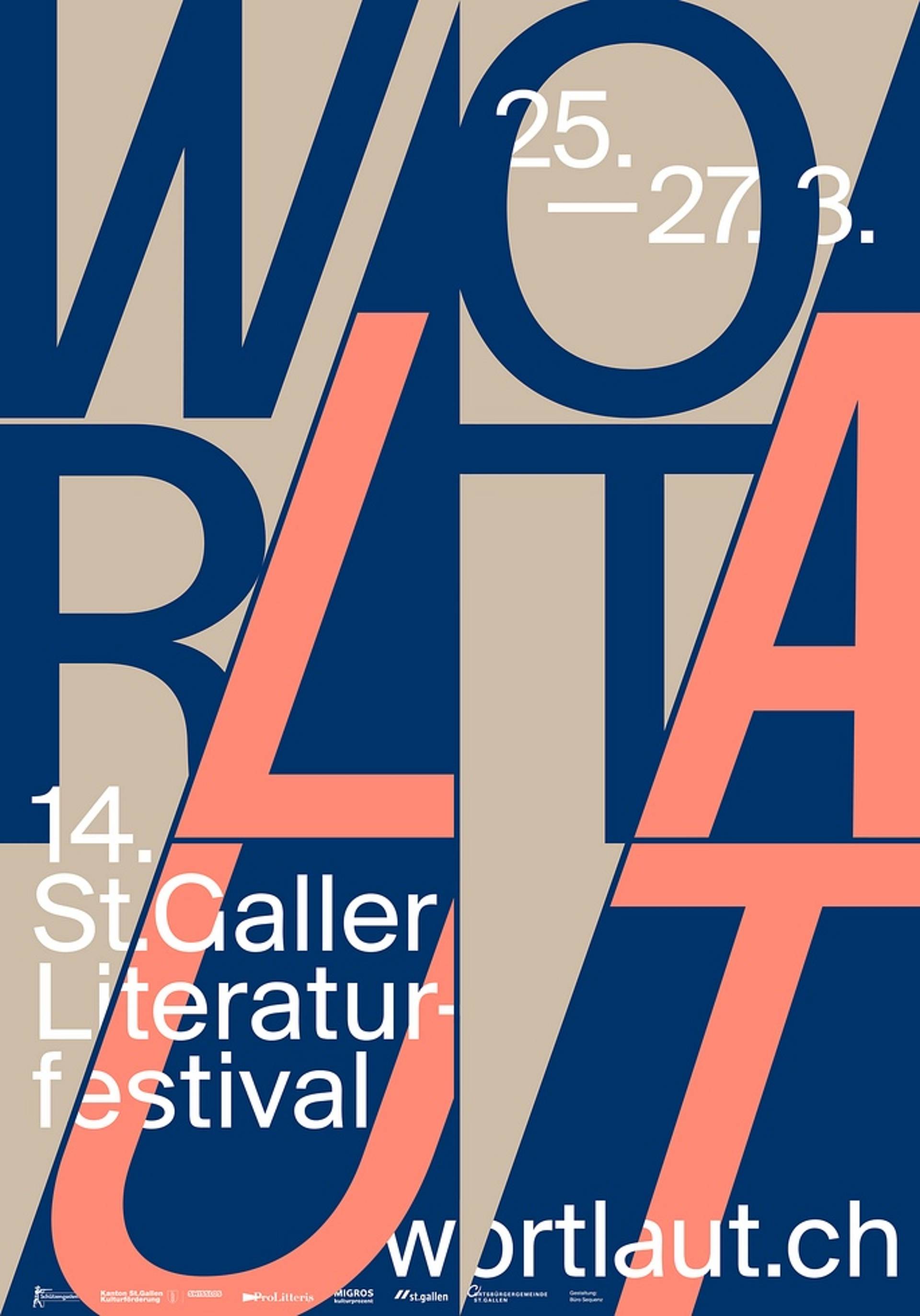 Für das Literaturfestival wird seit Jahren mit derselben Flächenteilung gearbeitet: Das Plakat wird durch zwei Diagonale und zwei Vertikale getrennt, die ein W bilden. Sascha Tittmann, Corina Gälli und Amanda Züst haben dieses Mal eine sehr radikale typografische Lösung gefunden. Sie verzichten komplett auf Bilder und verschaffen dem Schriftzug «Wortlaut» Raum. Das überzeugt, denn an Literaturtagen hat das Wort Gewicht. Diese Radikalität, dieses auf den Punkt bringen ist eine grosse Qualität. Darüber werden sich die Besucher/-innen der Vernissage bestimmt mit den Schöpfern/-innen unterhalten können. Alle Drei haben übrigens schon in einem Klassenzimmer an der Schule für Gestaltung St.Gallen Platz genommen und sind aktuell für den neuen Auftritt des Theater St.Gallen verantwortlich.