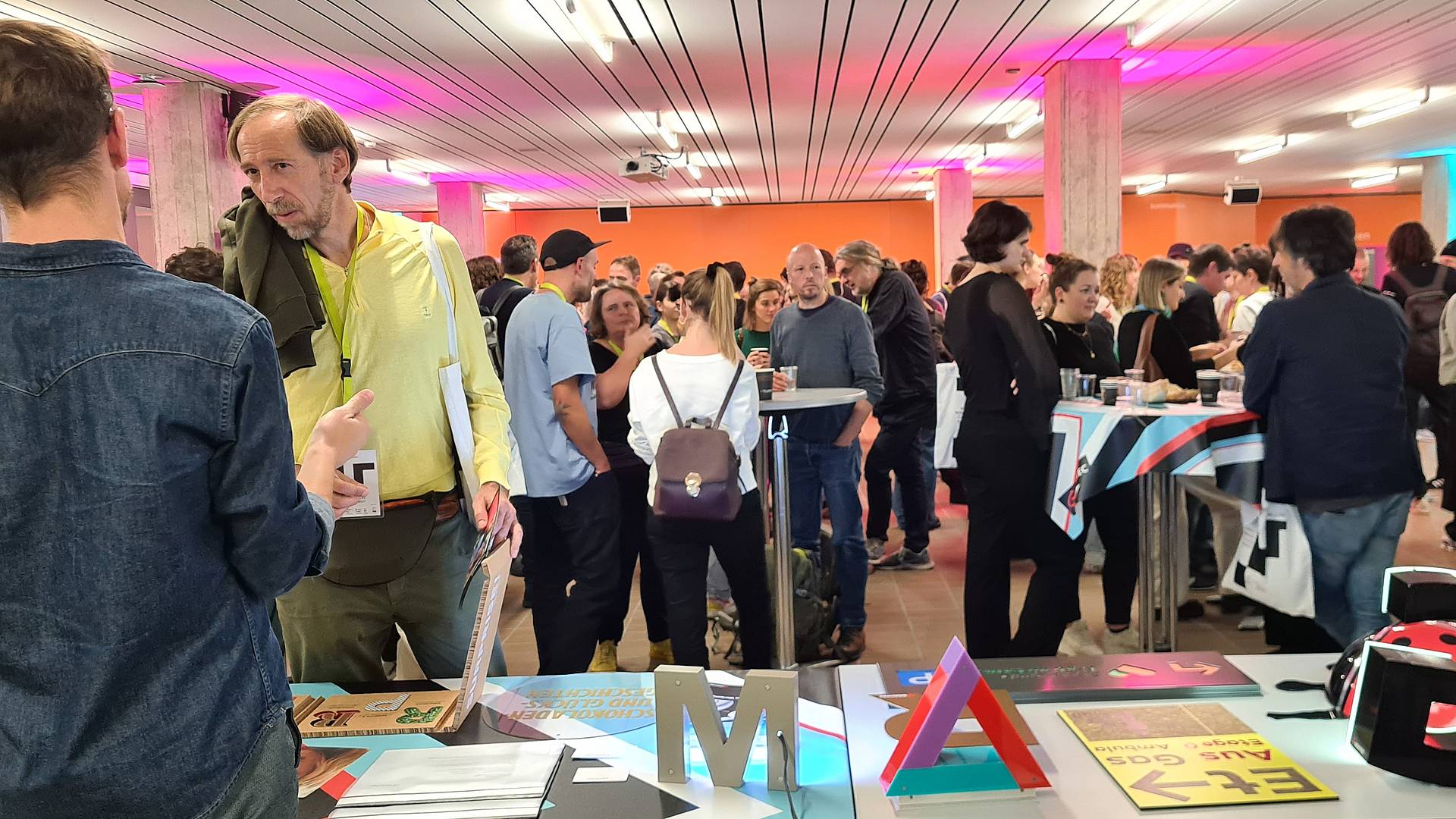 Weitere Vorträge kamen vom Büro 146. Madeleine Stahel und Maike Hamacher (Co-Lehrgangsleiterin Visuelle Gestaltung HF) legten dar, wie lange es nach der Entwurfspräsentation dauern kann, bis ein Buch erscheint. Zuvor sprachen mit den Grafikern Fabio Menet und Nayla Baumgartner von Data-Orbit zwei ehemalige Berufsschüler/-innen der Schule für Gestaltung St.Gallen über die Herausforderungen bei Pitches.