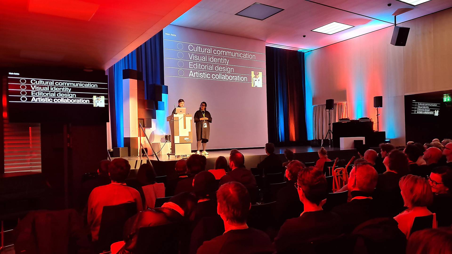 Die heutigen Schüler/-innen der Fachklasse Grafik halfen beim Aufbau, sorgten für einen reibungslosen Einlass der Gäste und blendeten von der Regie aus die richtigen Folien für die Referenten/-innen ein. Auf der Bühne moderierte Anne Treichel, Lehrgangsleiterin Design Essentials und Creative Design, gemeinsam mit Clemens Schedler. Zudem sitzt Anne Treichel gemeinsam mit Roland Stieger, Co-Lehrgangsleiter Visuelle Gestaltung HF, im OK-Team der Tÿpo St.Gallen.