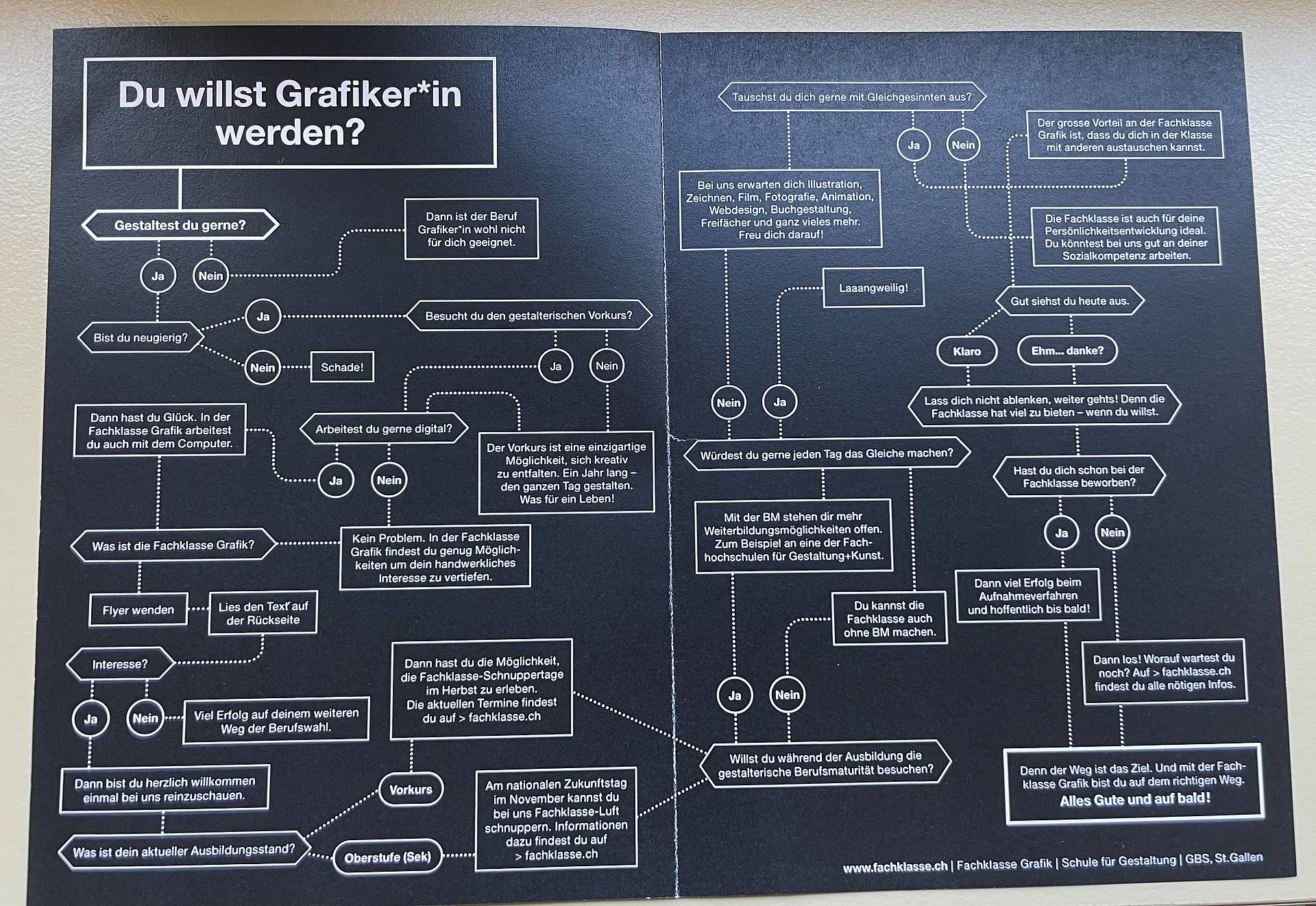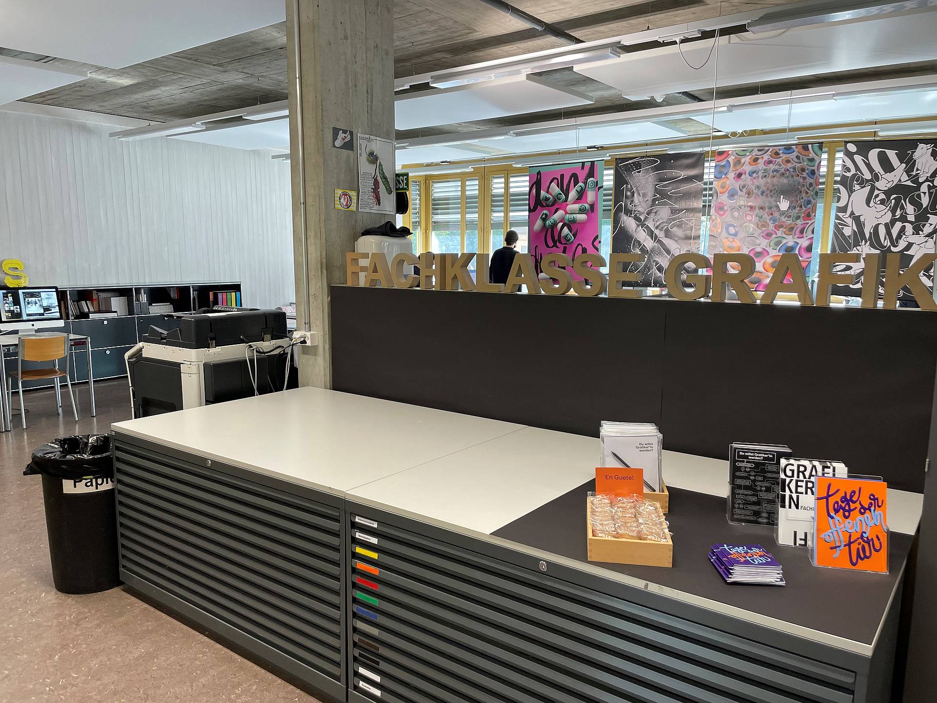An den Tagen der offenen Tür von heute Donnerstag bis Samstag, 25. September, geben wir Einblick in die Ausbildung Grafiker*in EFZ in der Fachklasse Grafik. Die Atelierräume stehen offen. Und: Es gibt ein eigens für diesen Anlass eröffnetes Café.