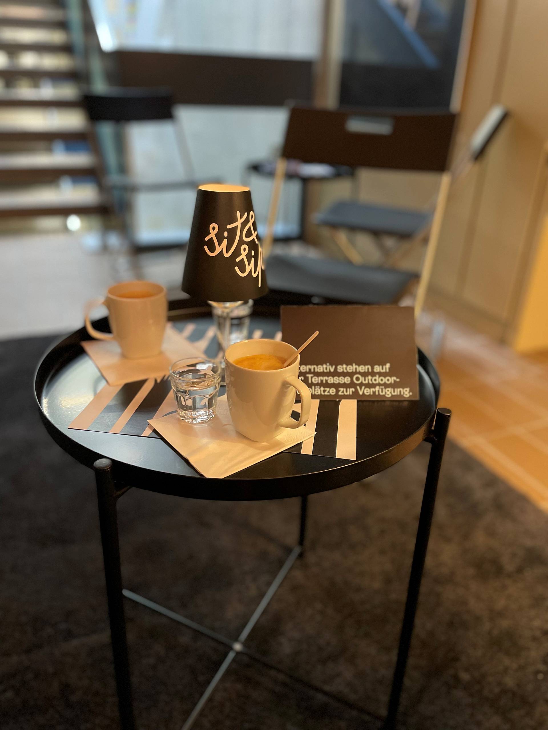 Geht man die Treppe hoch in den ersten Stock der Schule für Gestaltung, wähnt man sich dieser Tage in einem Coffee Shop à la Starbucks & Co. Theke, Kaffee, Kuchen, Sitzecken. Die Fachklasse Grafik hat für die Tage der offenen Tür ein kleines Café eingerichtet. Von Flyern über Lampenschirme und Menukarte haben die Schülerinnen und Schüler alles selber konzipiert und gestaltet. Ein erster Eindruck davon, was sich die angehenden Grafikerinnen und Grafiker während der vierjährigen Ausbildung an Kompetenzen und Wissen aneigenen.