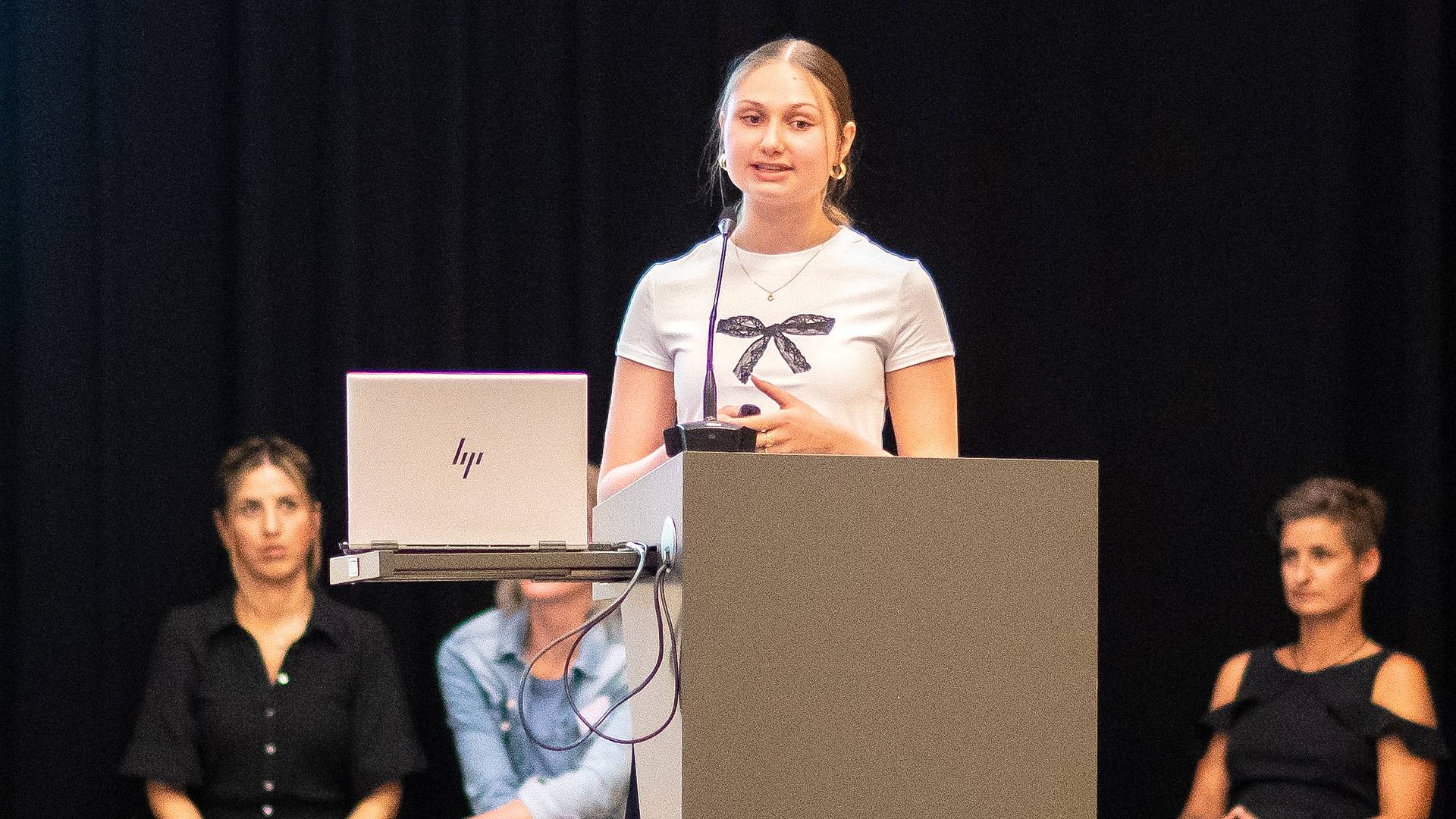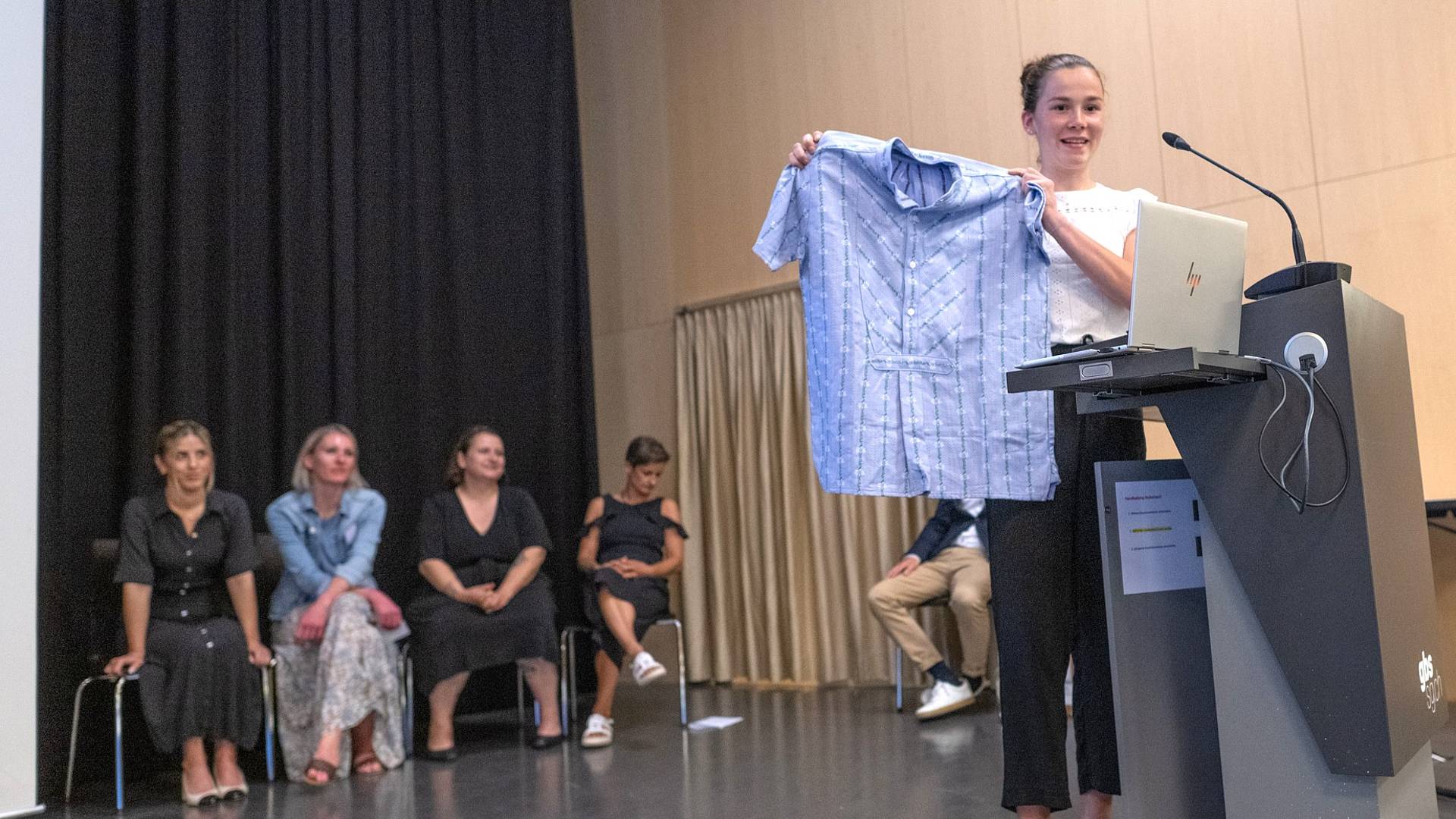 Die Freude von Tamara Hasler über ihr Edelweisshemd ist definitiv ansteckend und liess das Publikum in der Aula des GBS St.Gallen herzhaft lachen. Die Restaurantfachfrau EFZ besuchte für ihre Vertiefungsarbeit einen Nähkurs und dokumentierte im Anschluss die Herstellung ihres eigenen Edelweisshemdes akribisch auf mehreren Seiten mit eigenen Bildern. «Es hat mich gepackt. In der Zwischenzeit habe ich schon vier Hemden genäht», erzählte Tamara Hasler auf der Bühne.