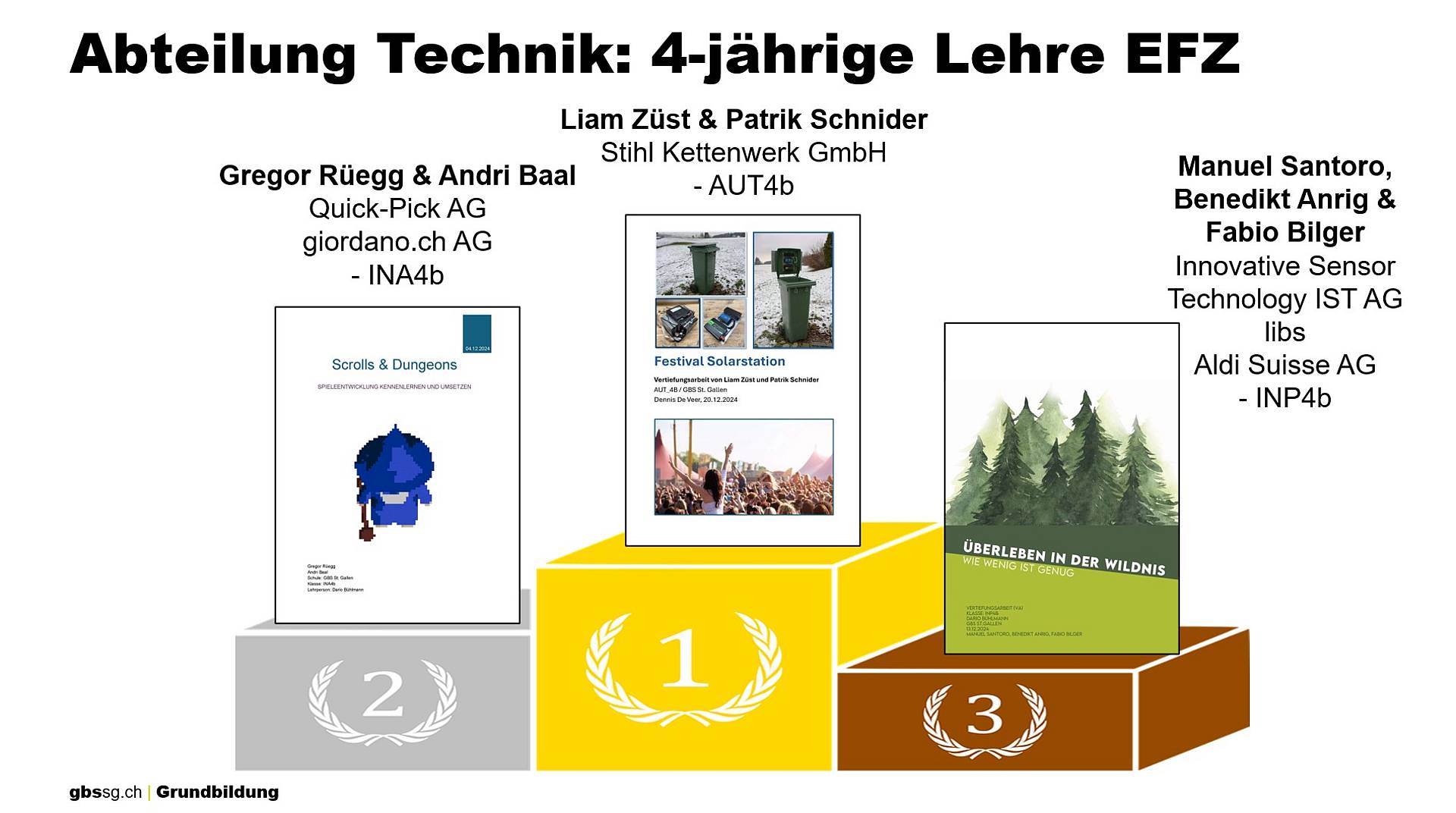 Ihren ersten Platz in der Kategorie der technischen Berufe über vier Lehrjahre werden Patrik Schnider und Liam Züst am Openair St.Gallen geniessen. Mit dabei haben sie ihre Festival-Solarstation. Die Idee dazu kam, als sich eine Musikbox unterwegs nur schwer laden liess. So entstand der Plan, eine günstige, solarbetriebene Powerstation für Outdoor-Einsätze zu bauen – montiert auf einer Grüntonne. Diese ist bei Festivals beliebt, robust, wasserdicht und bietet zusätzlichen Stauraum.