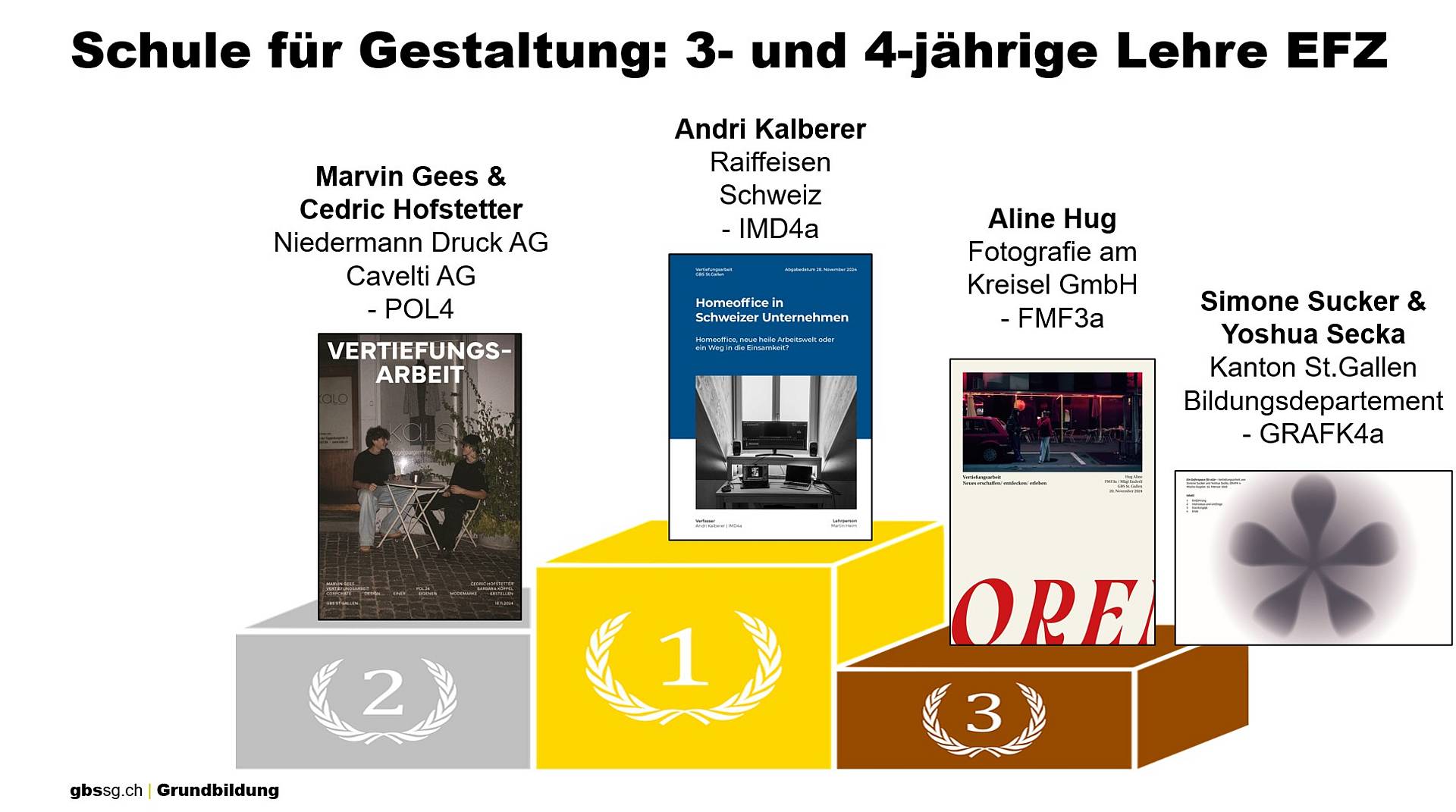 Bei den Gestaltungsberufen sicherte sich Andri Kalberer den ersten Platz. Der Interactive Media Designer EFZ befasste sich mit Homeoffice in Schweizer Unternehmen. Neben einer Umfrage unter Arbeitnehmenden führte er Interviews mit verschiedenen Führungskräften und einer Psychologin. Die Umfrageergebnisse zeigen, dass eine Mehrheit klare Vorteile sieht, von daheim aus zu arbeiten. Bei den meisten Befragten führt Homeoffice zu einer Steigerung der Lebensqualität.