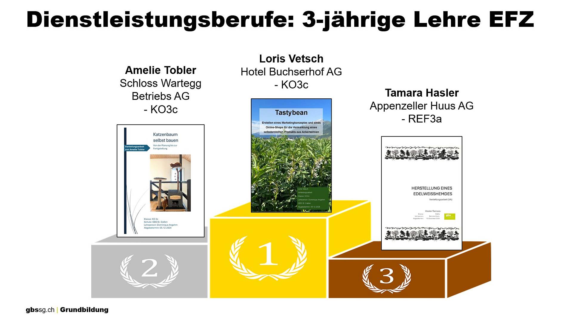 In der Kategorie vom Tamara Hasler trumpfte Koch Loris Vetsch mit seinem Marketingkonzept für sein eigenes Produkt aus Ackerbohnen auf – «Tastybean». Die ABU-Lehrerin Dominique Angehrn lobte in ihrer Laudatio: «Loris Vetsch hat sich nicht mit der ersten Version zufriedengegeben, sondern hat mit kritischem Denken seine Inhalte überarbeitet und optimiert.»