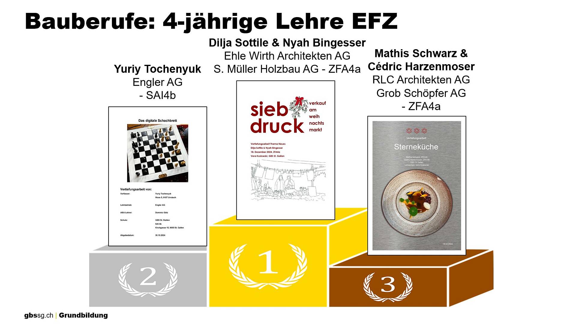 Bei der vierjährigen Lehre schwangen mit Dilja Sottile und Nyah Bingesser zwei Zeichnerinnen Fachrichtung Architektur obenaus. Das Duo erlernte die Siebdrucktechnik und hielt die hergestellten Designs in einer Fotodokumentation fest.