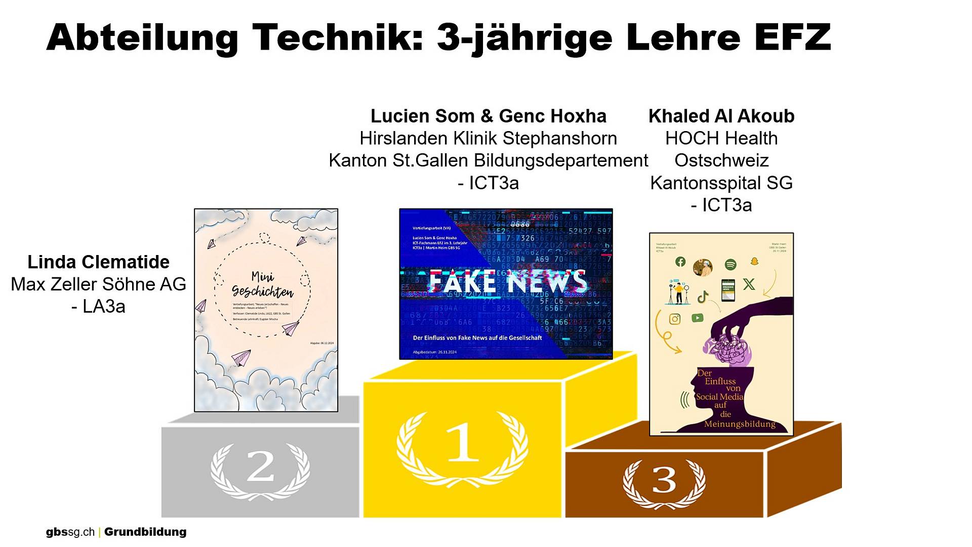 Genc Hoxha und Lucien Som untersuchten den Einfluss von Fake-News auf die Gesellschaft. In ihrer Arbeit halten die beiden fest: «Zusammenfassend lässt sich sagen, dass die Verbreitung von Fake News eine grosse Bedrohung für unsere Gesellschaft ist. Die Menschen werden manipuliert und in die Irre geführt.»