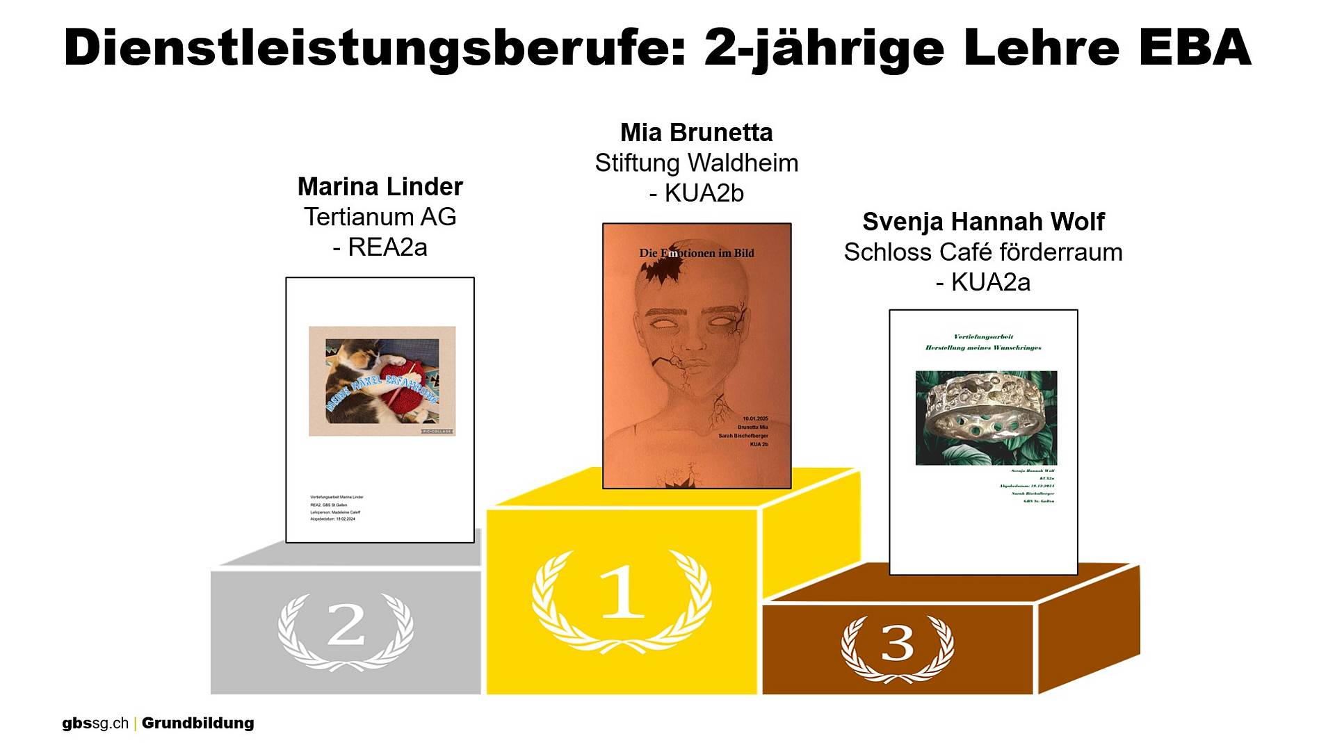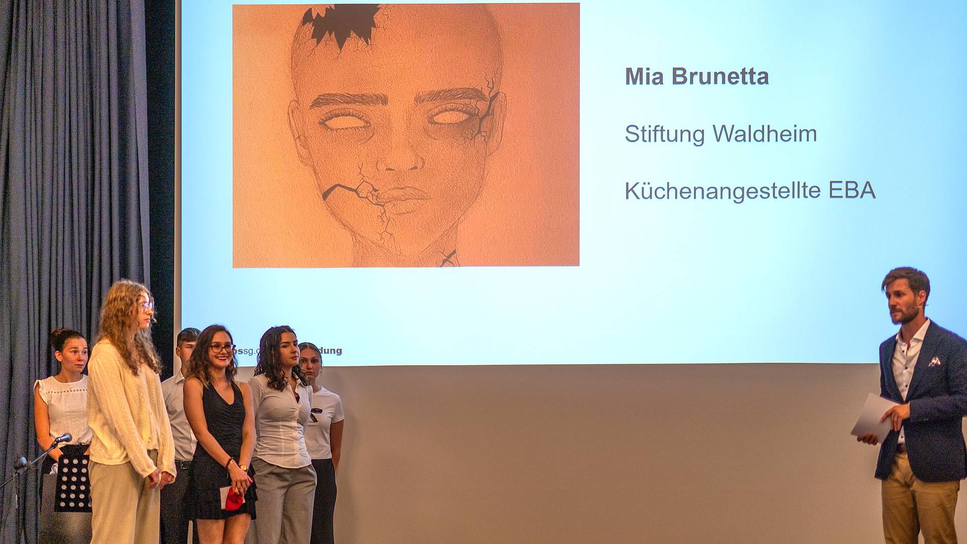 Emotional geprägt wurde die abwechslungsreiche Prämierungsfeier – die gelungene Mischung aus Laudatien, Filmeinspielern und Präsentationen kam gut an – ein zweites Mal durch die Dienstleistungsberufe. Mia Brunetta, Küchenangestellte EBA, lernte, mit Ölfarben zu malen. Ans Publikum gerichtet erklärte die Erstplatzierte: «Malen ist für mich ein Weg, der Wirklichkeit zu entkommen, da es keine Regeln gibt.» Bei ihrer Wahl des Sujets konzentrierte sie sich auf drei verschiedene Emotionen, welche die im Bild gemalten Personen bei den Betrachtenden auslösen sollen.