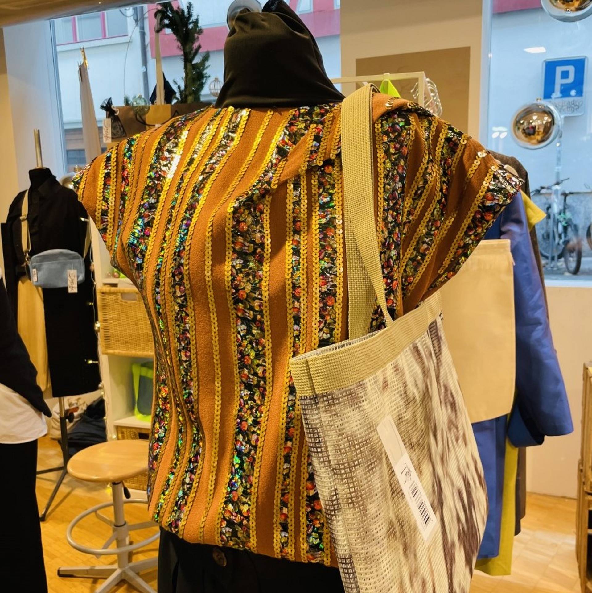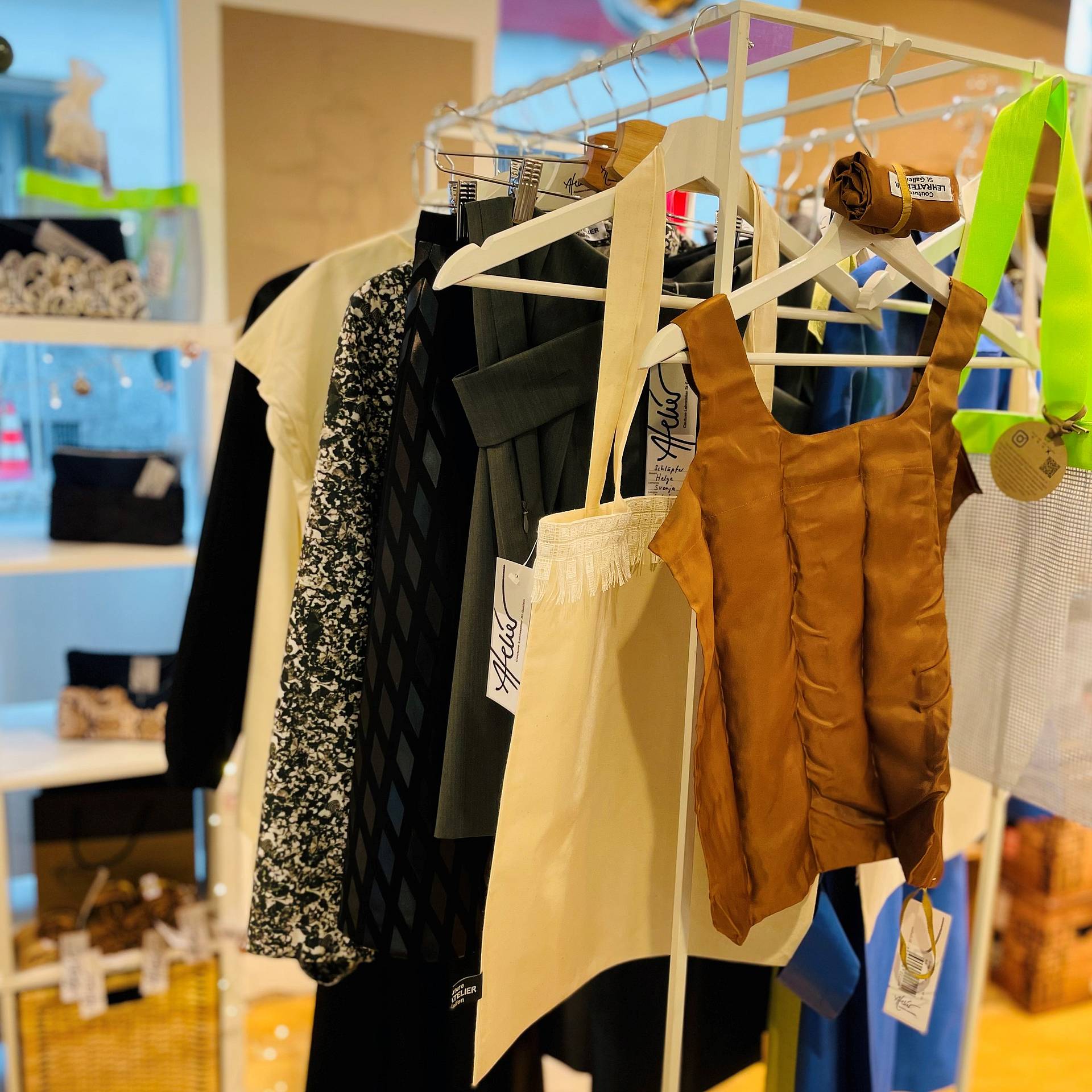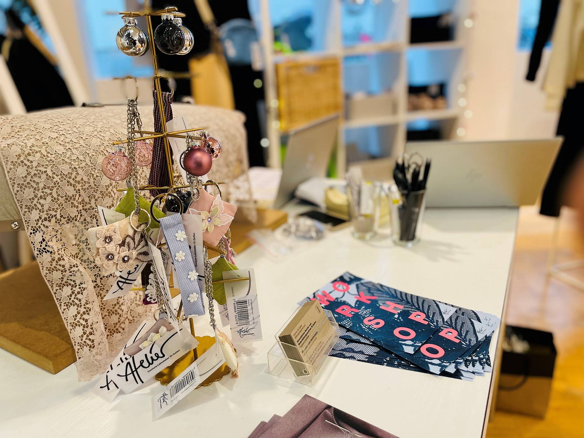 Besuch im Pop-Up-Store an der Spisergasse 12. Der Verkaufsbereich unseres Lehrateliers befindet sich im Erdgeschoss, links in der Ecke. Das Angebot: liebevoll im Detail, handgemacht, einzigartig. Die Lernenden, angehende Bekleidungsgestalterinnen und Bekleidungsgestalter, haben ganze Arbeit geleistet. Sie verkaufen hier funkelnde Oberteile, Mäntel, Make-Up-Täschchen oder Accessoires, aus Stoffen und Spitzen von Forster Rohner und Schläpfer.