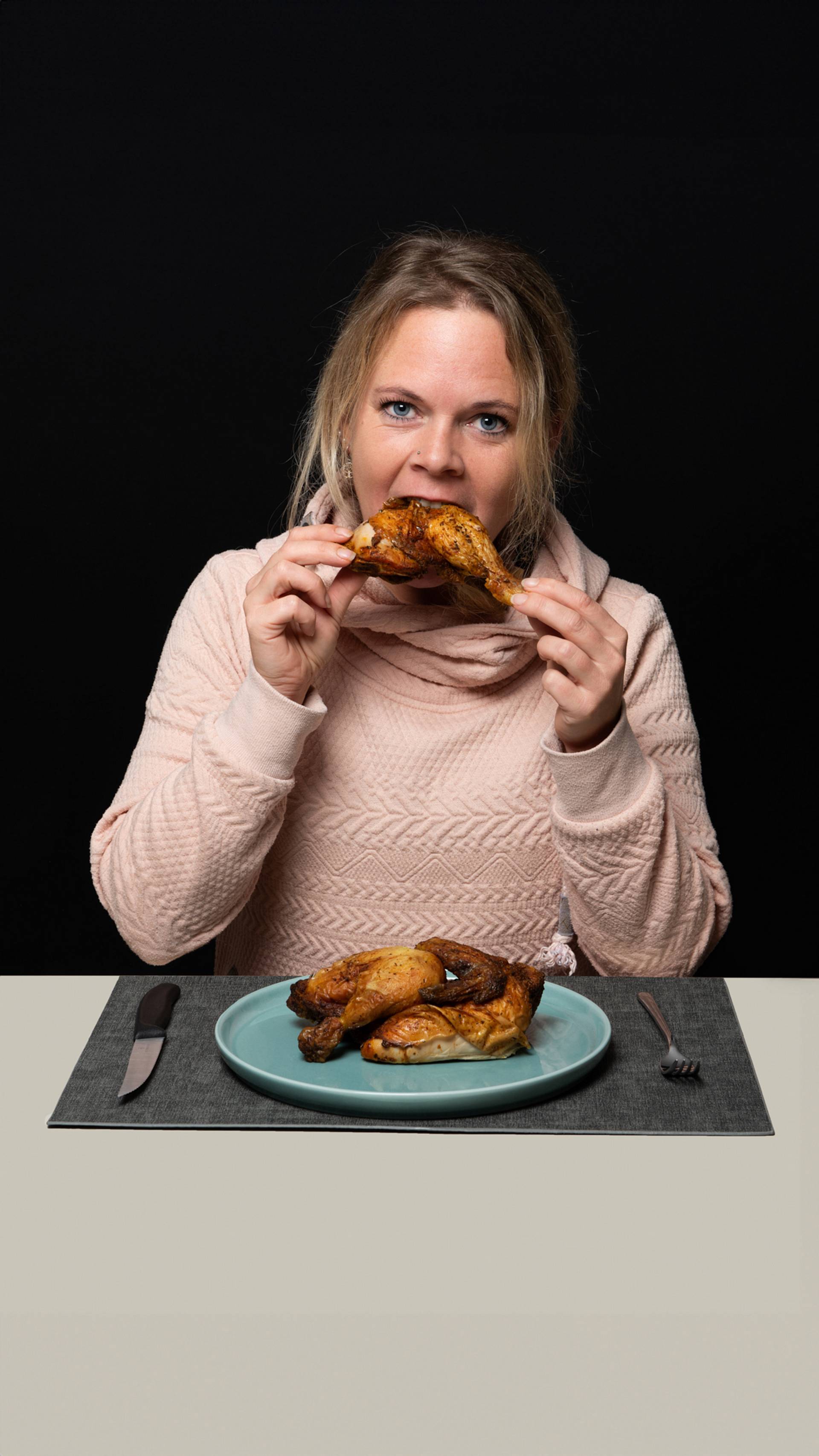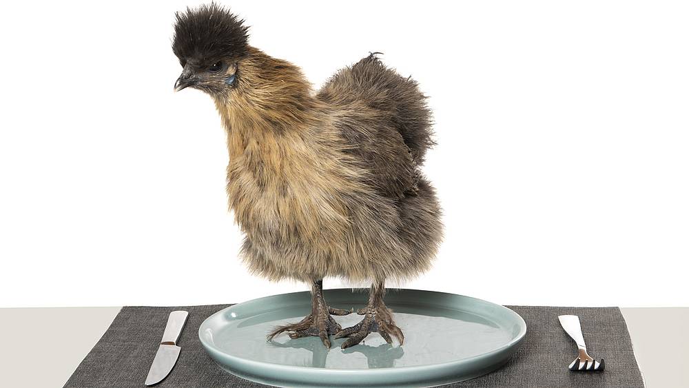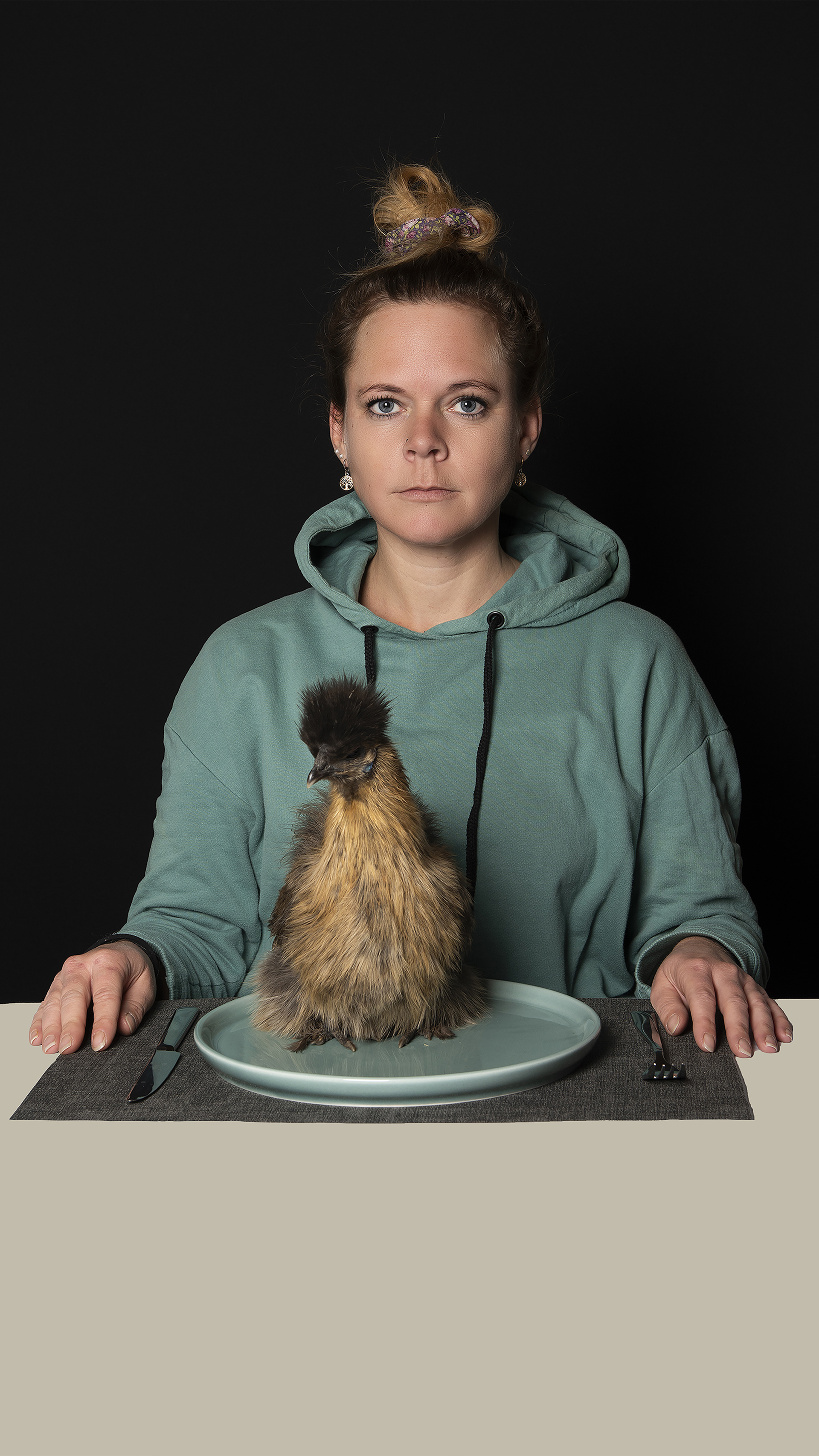 «Zum (Fr)essen gern» – das Bild von Jolanda Aschwanden zeigt das Seidenhuhn Brunhilde mit ihrer Halterin Tina. Es soll aufzeigen, dass hinter den leckeren Chicken Nuggets ein lebendiges Tier steckt. Ein Lebewesen, das für unseren Genuss sein Leben lassen musste. «Unsere kontroverse Beziehung zu den Tieren wollte ich abbilden. Das war mir ein persönliches Anliegen», sagt Jolanda Aschwanden.