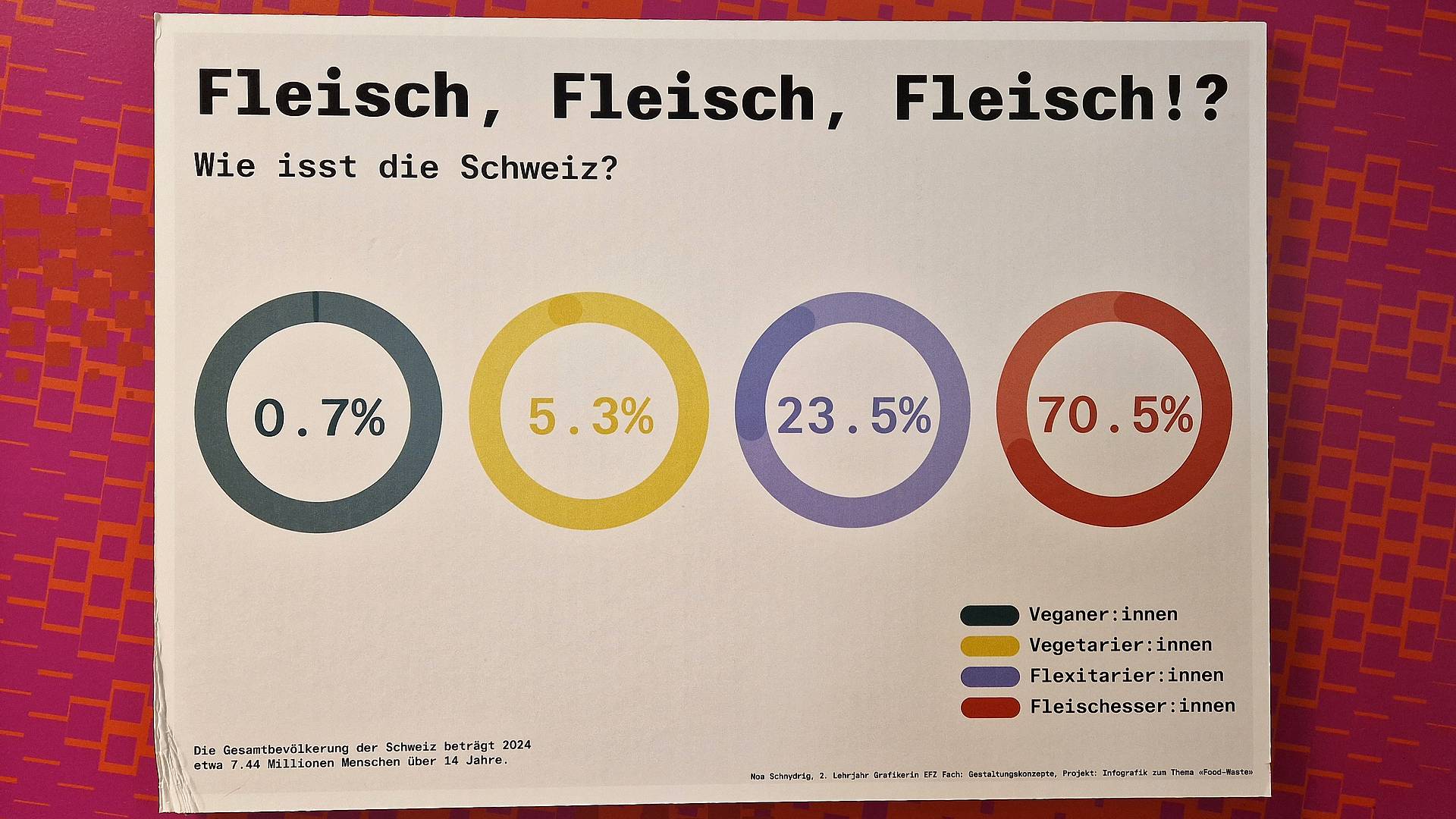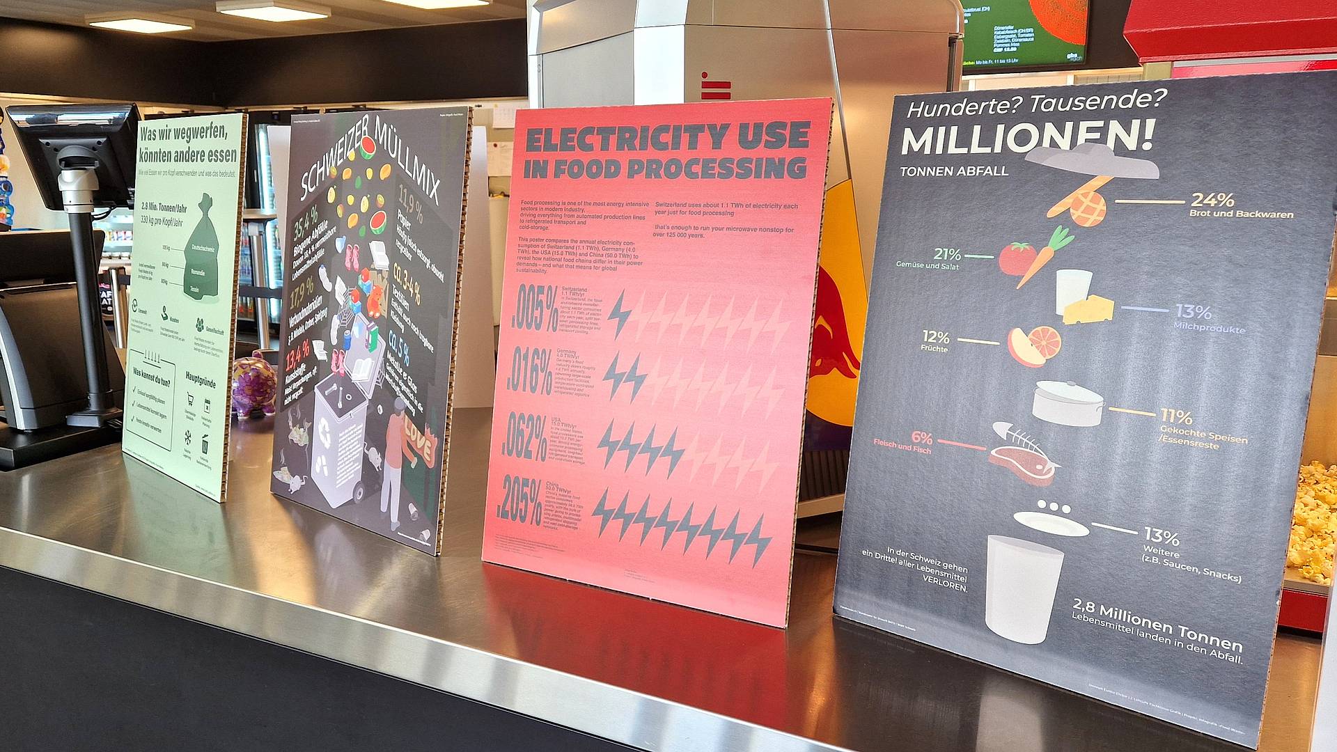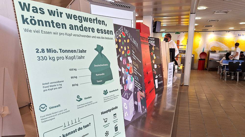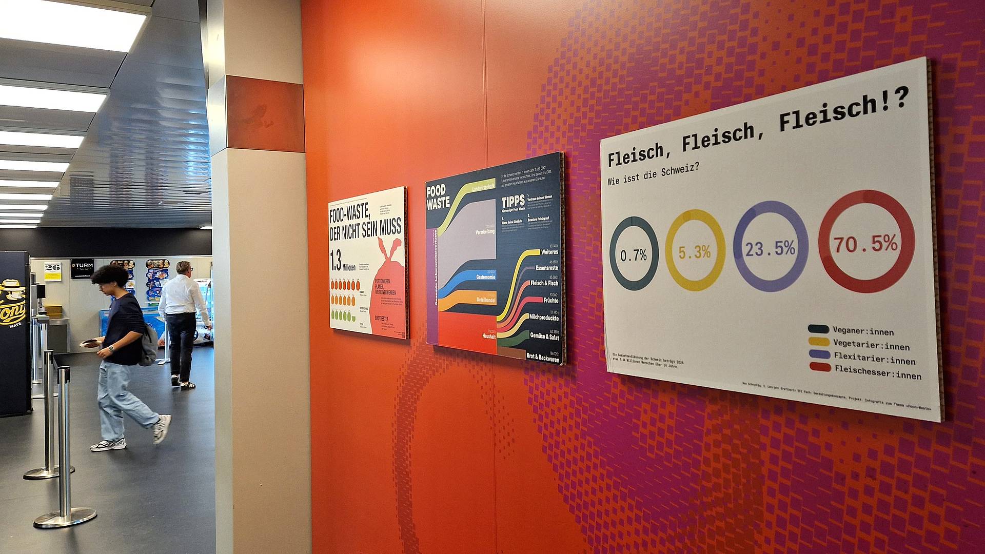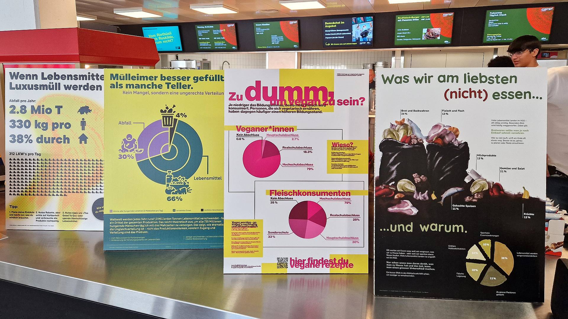 Die angehenden Grafiker/-innen EFZ machen das Thema Foodwaste auf Infografiken sichtbar. Im Restaurant Mampf sind die Infotafeln aufgestellt. Darauf sind komplexe Zahlen und Fakten zu Lebensmittelkonsum, Essgewohnheiten und Verschwendung in der Schweiz verständlich und ansprechend gestaltet.