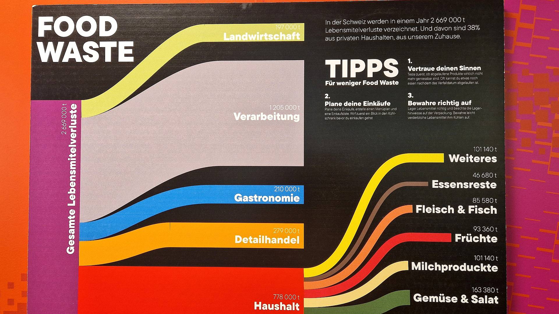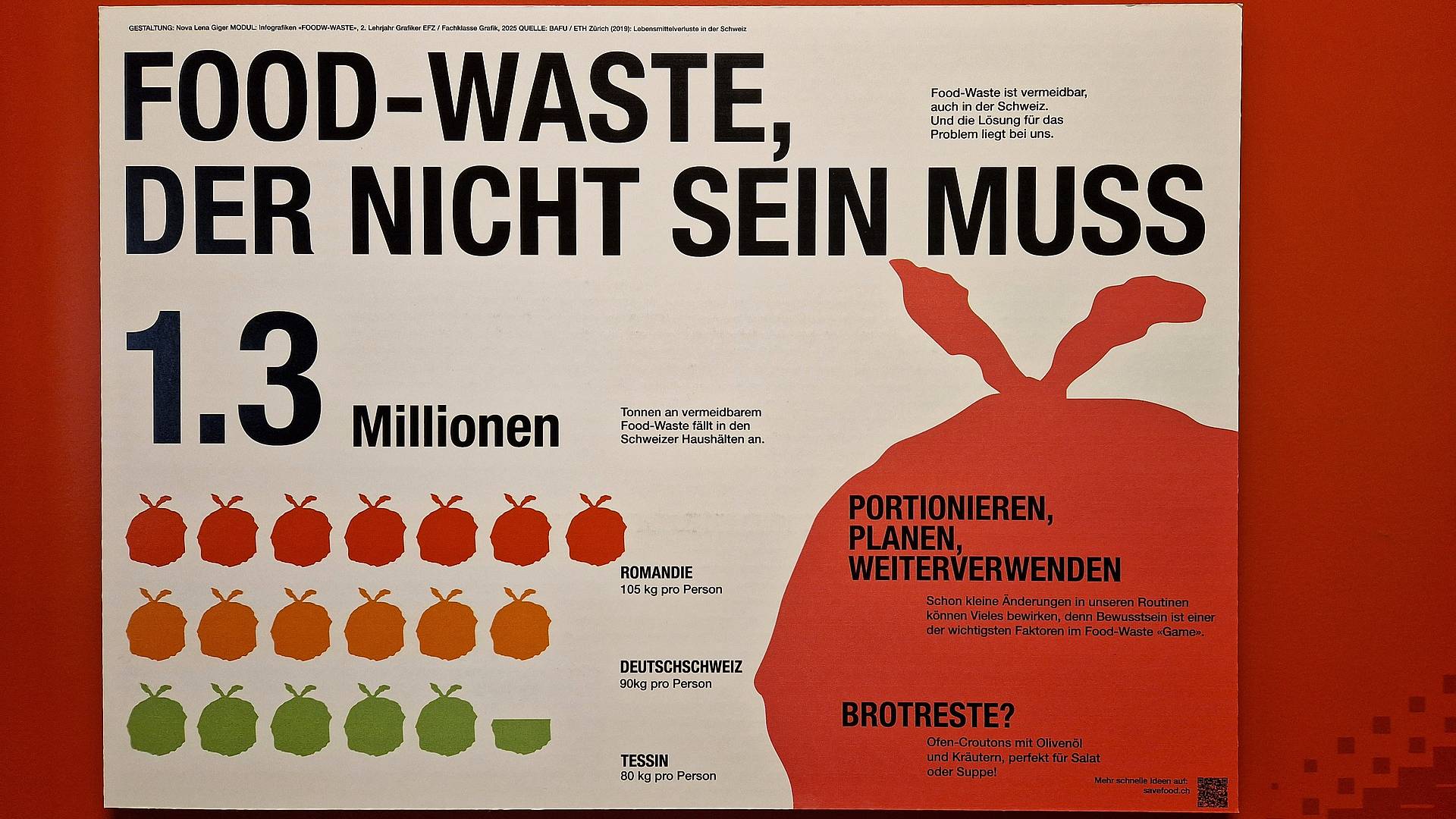 Rund 2,8 Millionen Tonnen vermeidbare Lebensmittelverluste fallen in der Schweiz jährlich an. Diese Menge entspricht etwa 330 kg pro Person pro Jahr, wie aus einer Studie der ETH Zürich im Auftrag des Bundesamtes für Umwelt hervorgeht. Die Grafiker/innen EFZ haben in ihrem Unterricht am GBS St.Gallen diese und weitere trockene Daten in Infografiken verwandelt, die eine Geschichte erzählen.