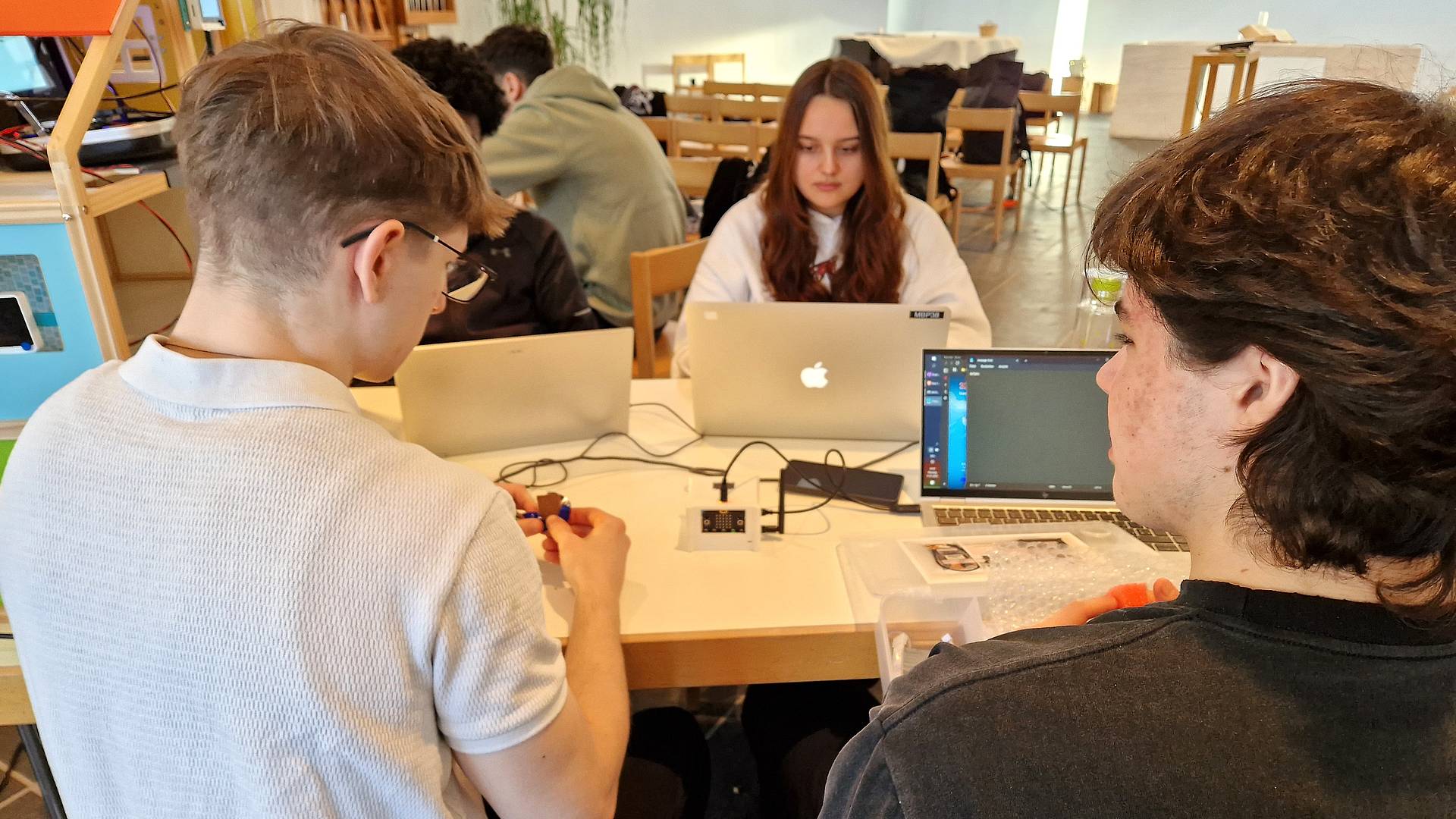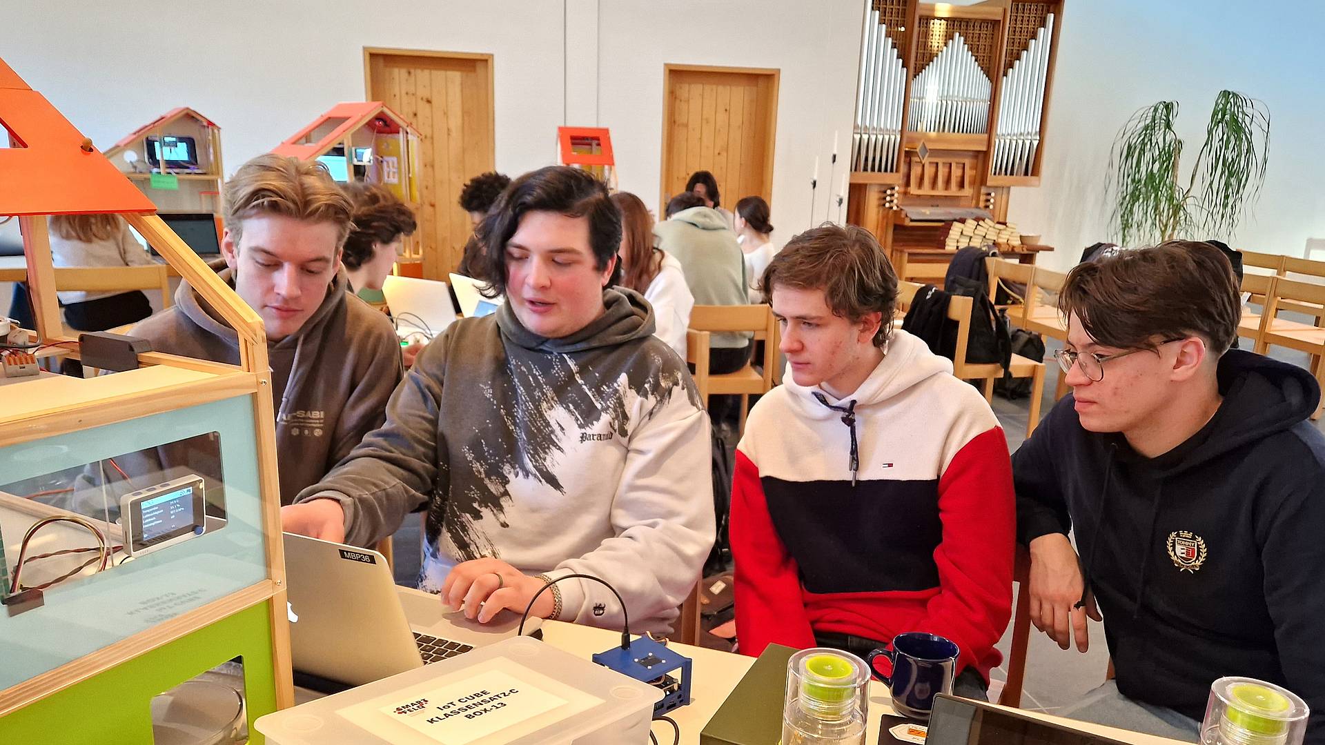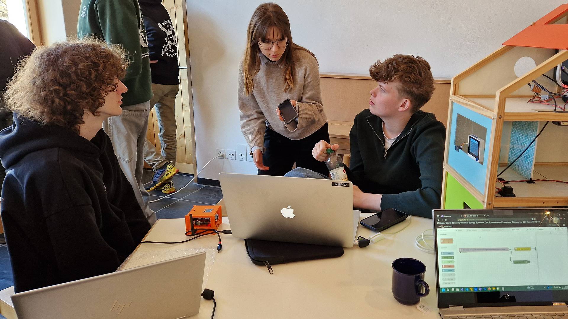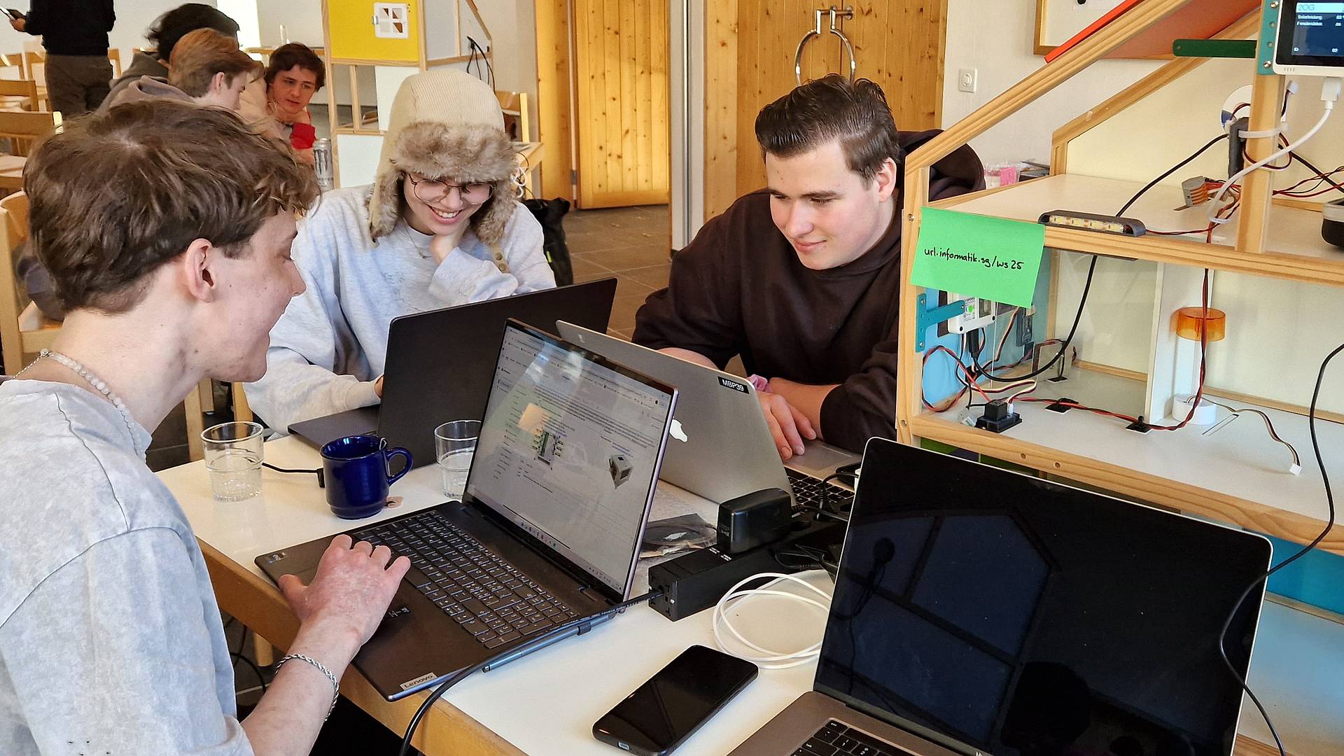 Ist der Auftrag jetzt besser verständlicher? Grafikerin Lisa nimmt an der «WinterSpring»-Projektwoche im Kirchgemeindehaus in Savognin teil und sagt: «Für mich ist aus technischer Sicht alles neu, spannend und gleichzeitig verwirrend. Bis jetzt haben wir aber dank gegenseitiger Unterstützung alles hinbekommen.» Die Teilnehmenden lernen in gemischten Teams aus Lernenden des Graphic Lyceum Rotterdam und Lernenden der Technischen Abteilung sowie der Schule für Gestaltung des GBS St.Gallen, wie man IoT-Daten sammelt, diese bearbeitet und visualisiert.
