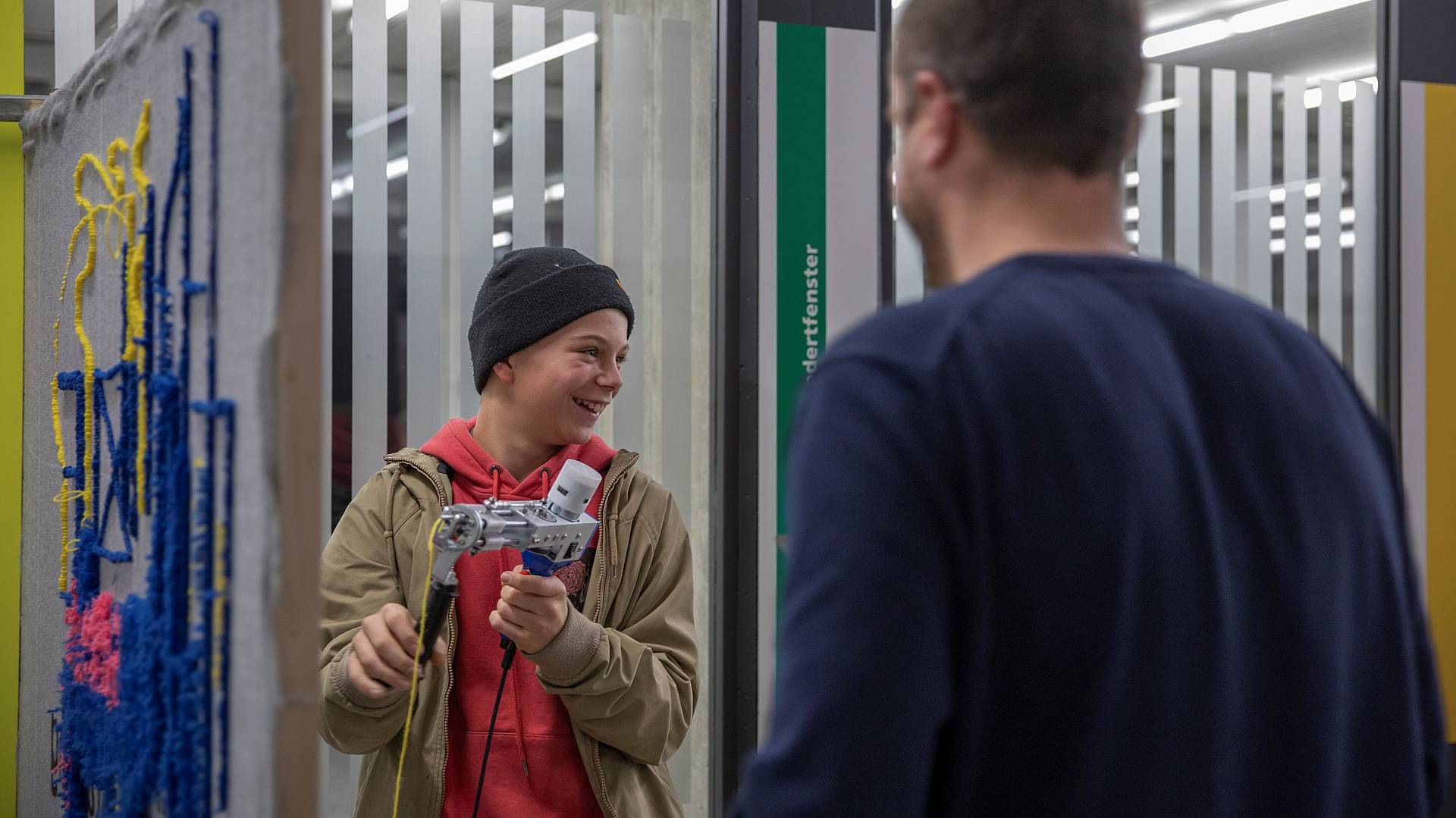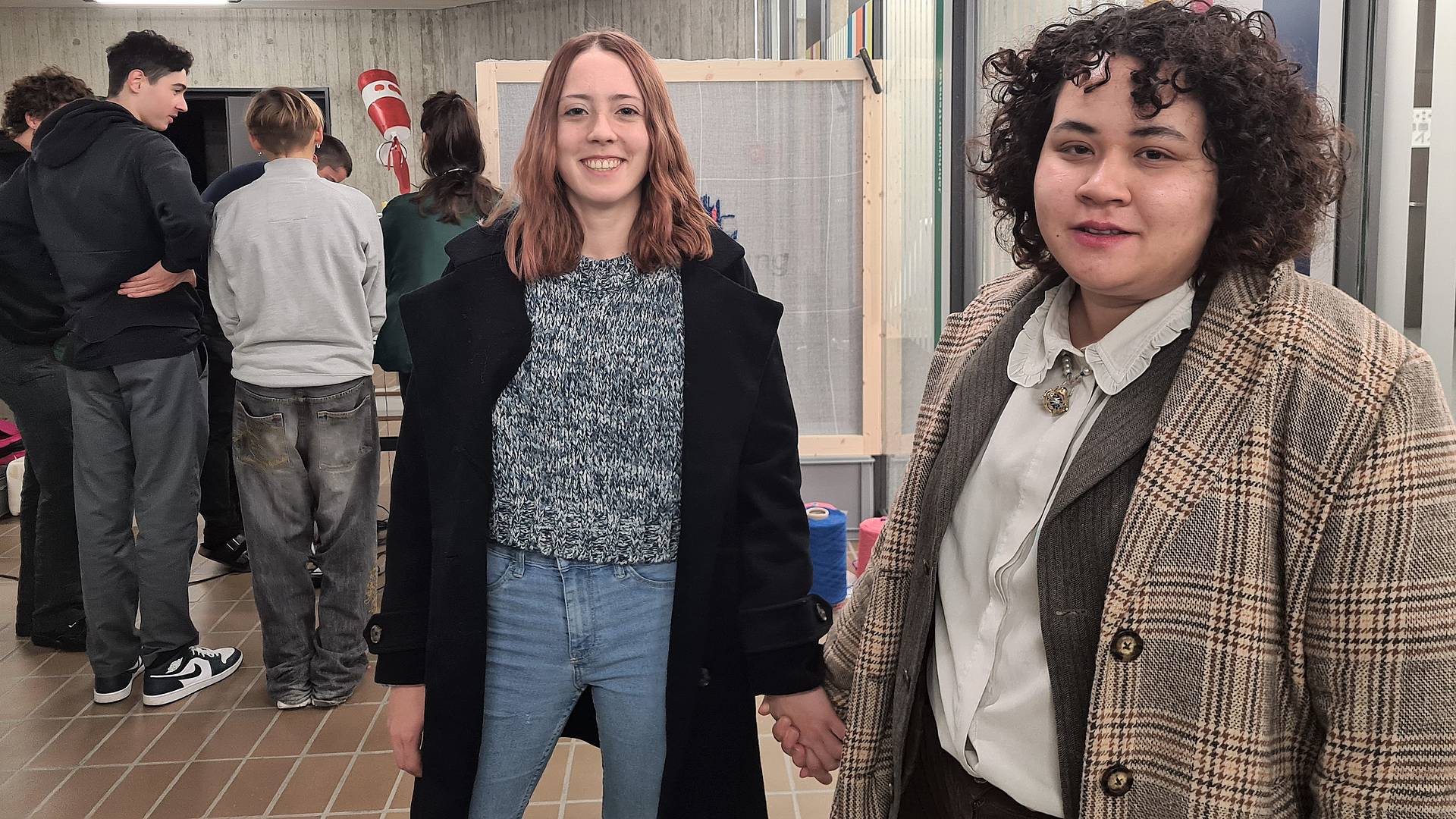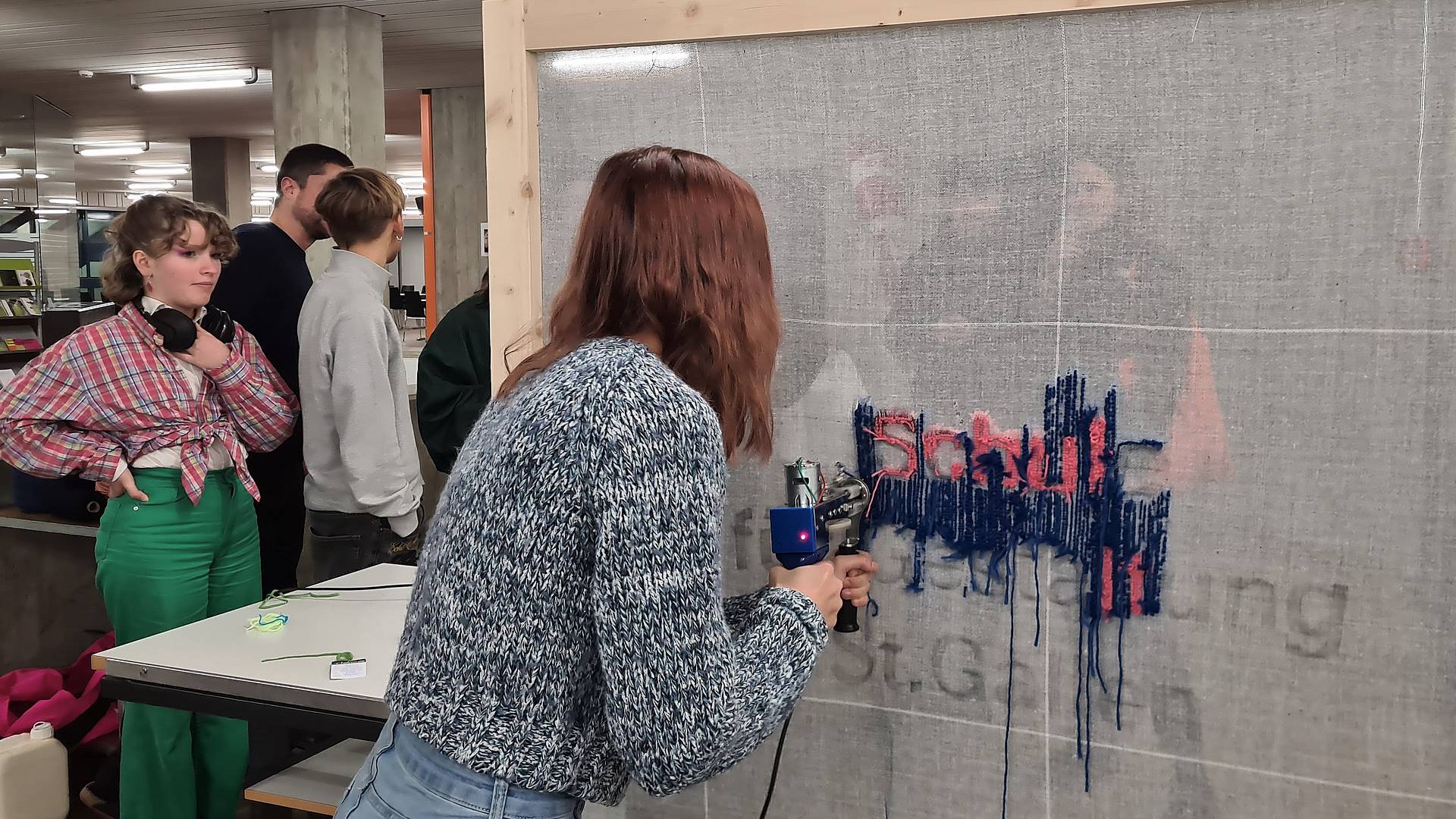 «Ich war schon einmal an der Zeichennacht und wollte wieder mit dabei sein, weil man hier so viele Möglichkeiten ausprobieren kann», erklärt Priscilla (rechts im Bild). Die ehemalige Schülerin des Gestalterischen Vorkurses hat ihre Kollegin Pascale mitgenommen. Diese half sogleich mit, den ersten Zeichennacht-Teppich zu erschaffen. Die Grafikerin EFZ testete die Tufting-Gun. Ihr Fazit: «Ich habe den Social-Media-Trend Tufting heute zum ersten Mal live miterlebt. Es hat durchaus eine meditative Wirkung und jedes kunstvolle Motiv scheint möglich.» Im Anschluss sicherten sich die beiden einen Platz fürs Aktzeichnen. Dieser Kurs ist neu auch an einzelnen Abenden flexibel buchbar (mehr Infos).