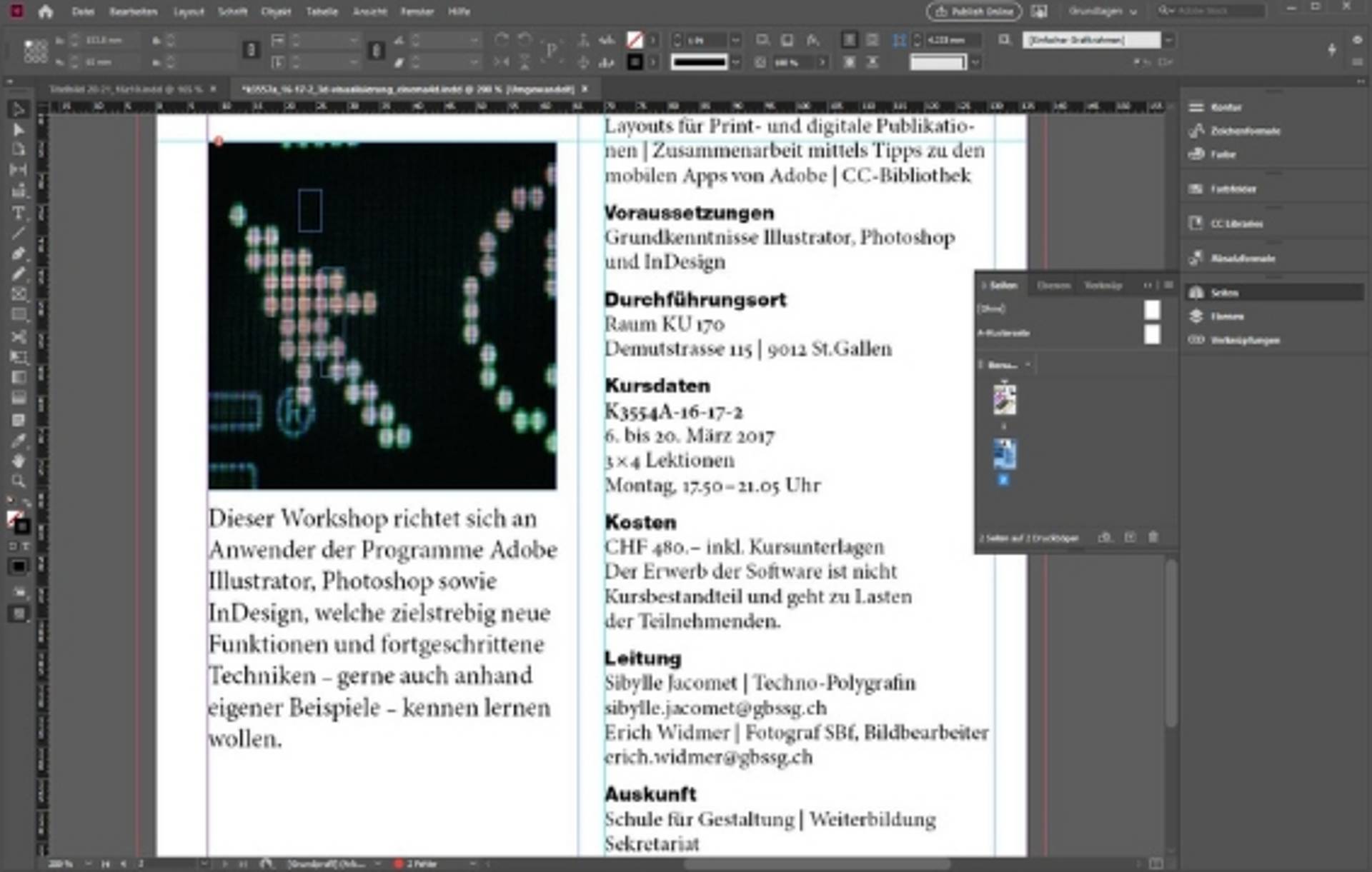 Der Kurs findet auf deinem eigenen Gerät statt. Du bringst es mit installiertem Programm (InDesign aktuellste Version) und Ladegerät mit zum Kurs. Gegen eine Gebühr von CHF 10.– in bar kannst du im Kurs einen grossen externen Bildschirm zubuchen.