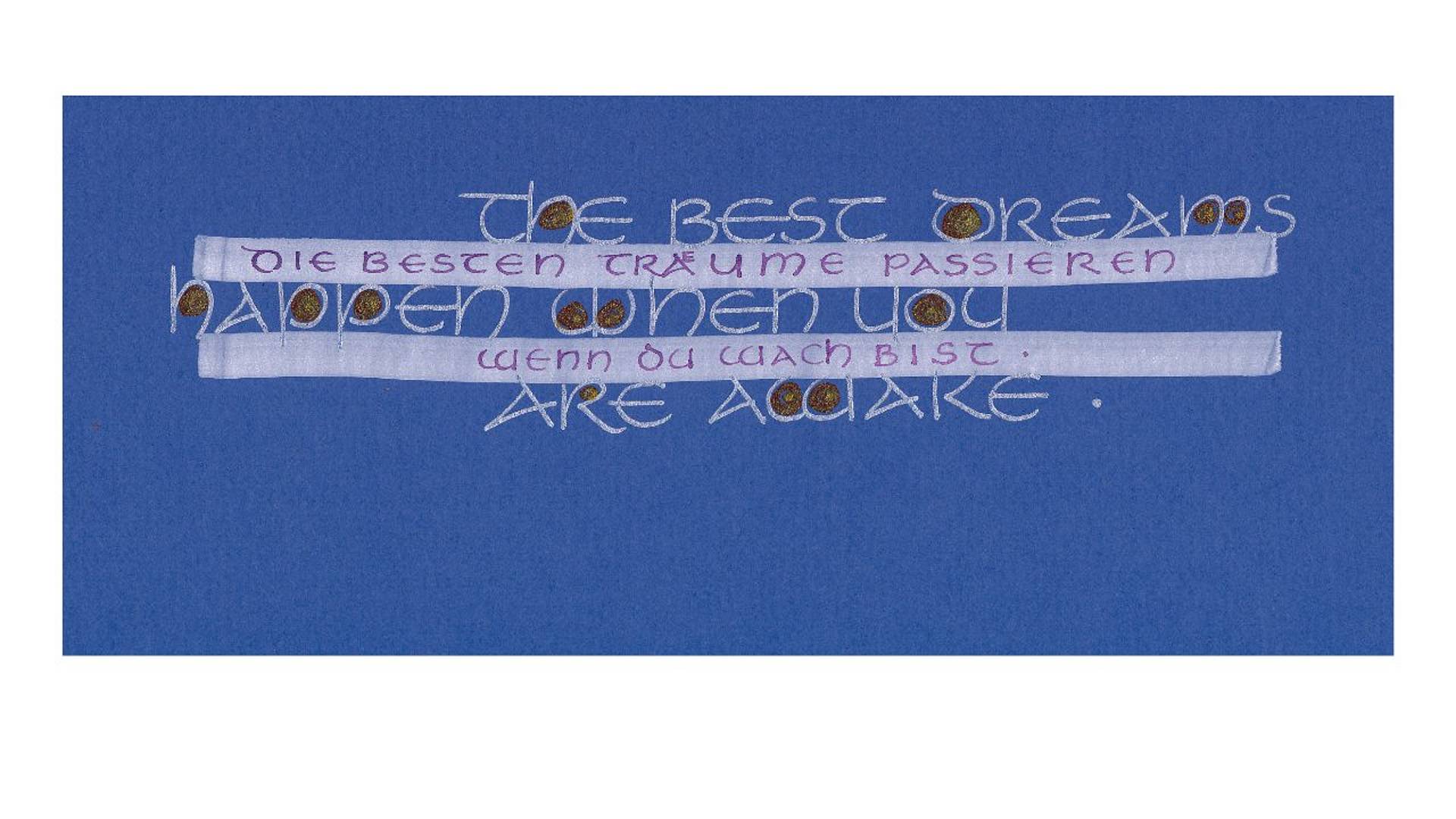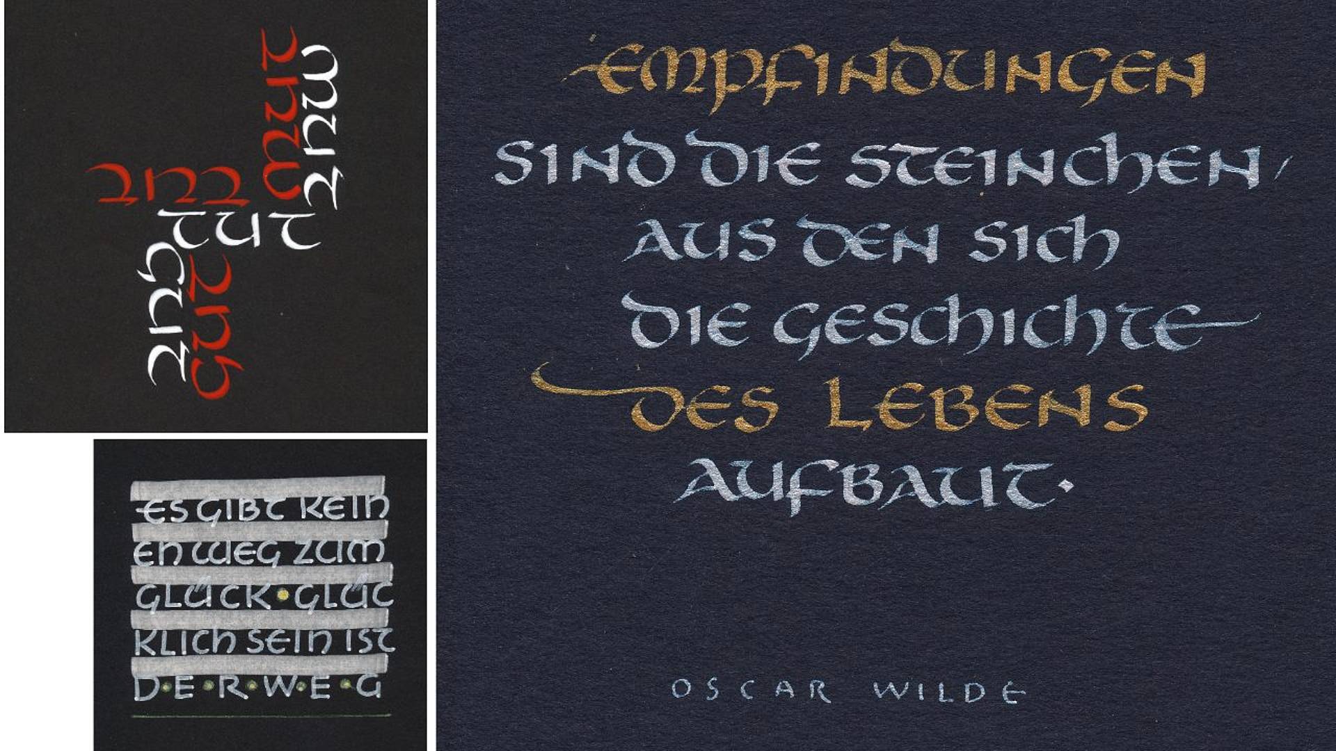 Du schreibst und gestaltest mit Wasserfarben. Zudem hast du die Möglichkeit, eigene Schriftprojekte mit Begleitung umzusetzen und deine «eigene» UNZIALIS-SCHRIFT zu entdecken. Kursleiter ist der Präsident der Schweizerischen Kalligrafischen Gesellschaft.